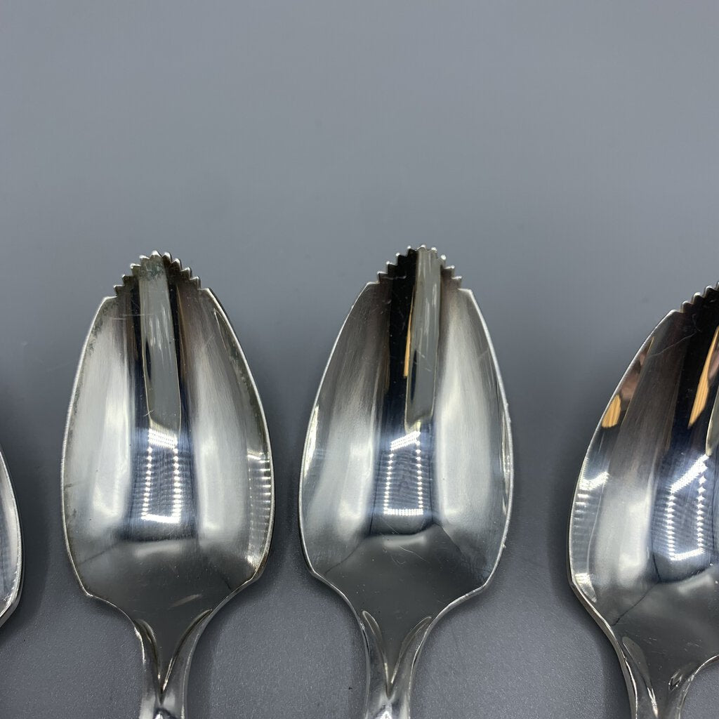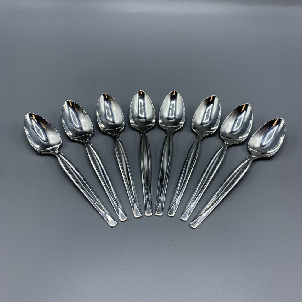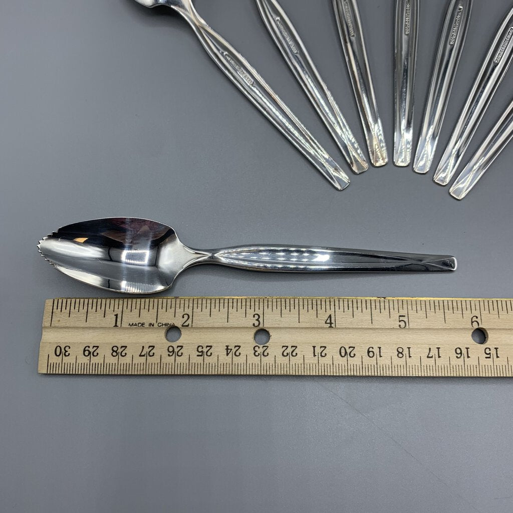 Great set of eight silverplate grapefruit/citrus spoons made by WM Rogers between the 1960s and 1970s. They are the “Nassau” pattern which features slightly rounded, tapered sides, and graceful line designs that cross near the base of the handle creating subtle geometric shapes.