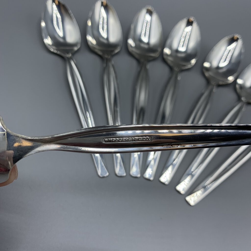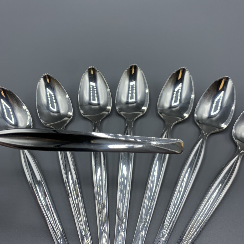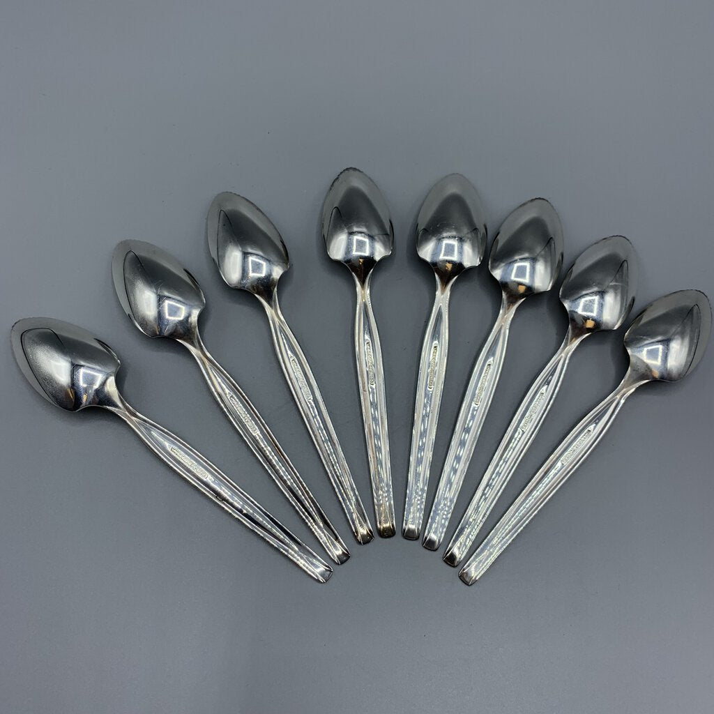 Great set of eight silverplate grapefruit/citrus spoons made by WM Rogers between the 1960s and 1970s. They are the “Nassau” pattern which features slightly rounded, tapered sides, and graceful line designs that cross near the base of the handle creating subtle geometric shapes.