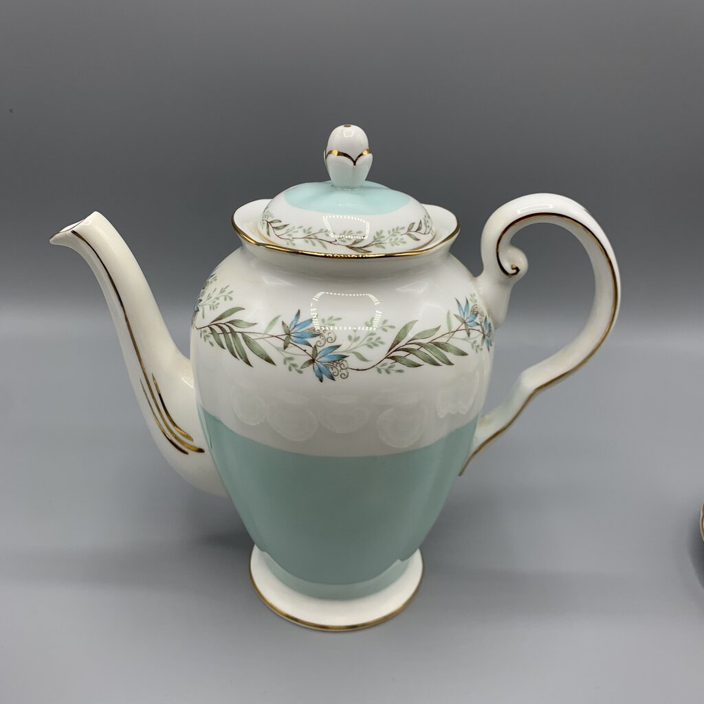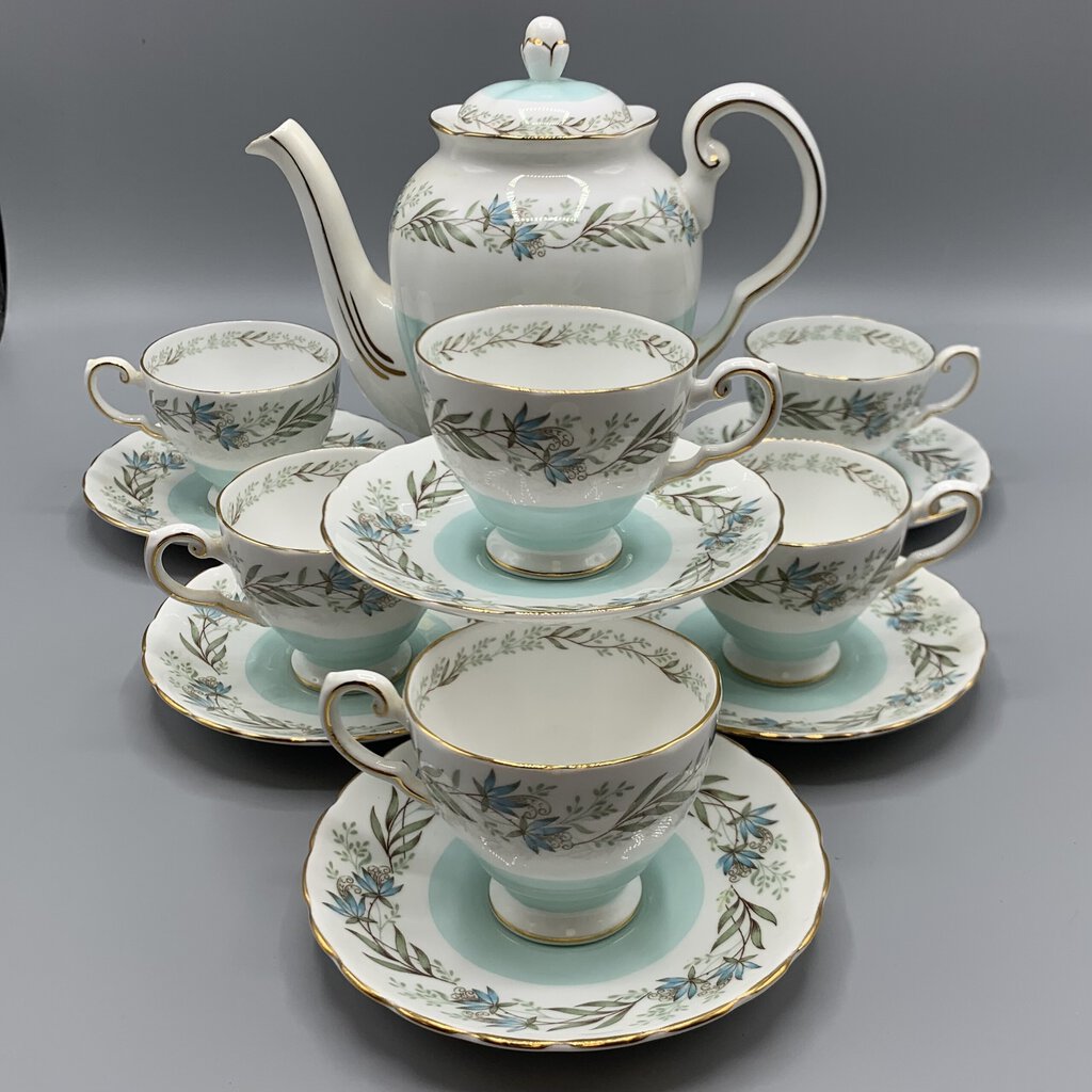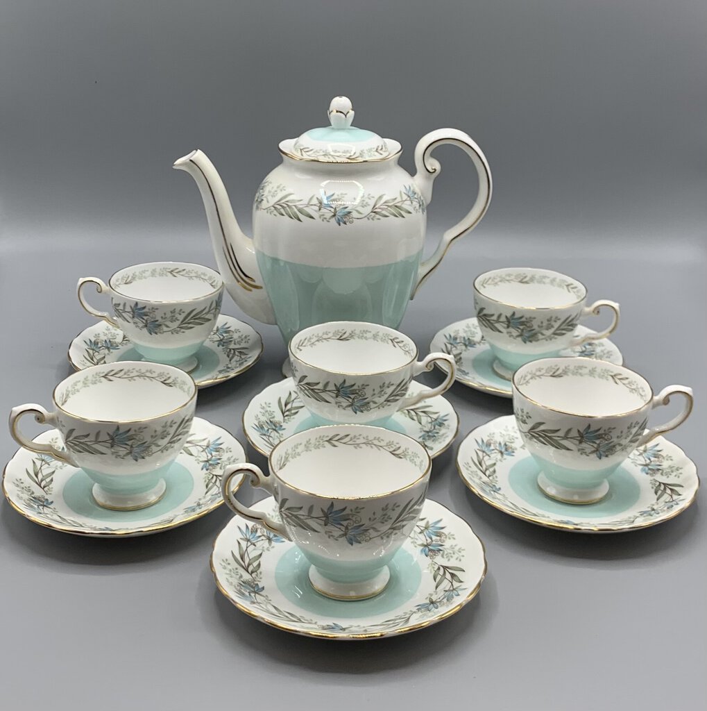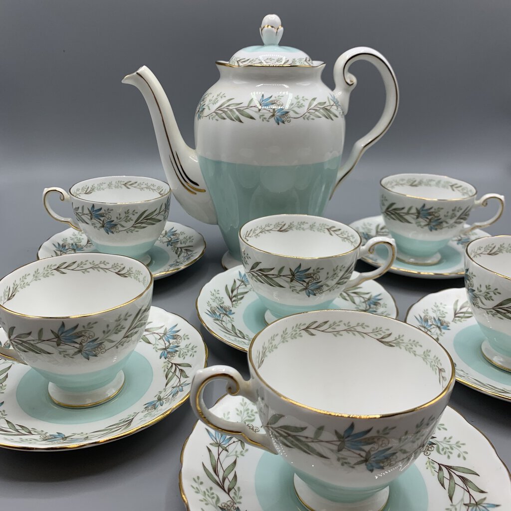 Timeless elegance and charm with this beautiful tea or coffee set made by Tuscan Fine China of Staffordshire, England. The colors and floral garland design are so pretty! This pattern was made pre 1967 because after that Wedgwood bought Tuscan and renamed them Royal Tuscan. I would date this at early 1960s.