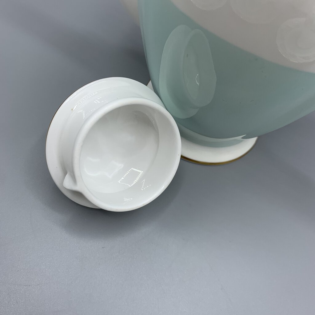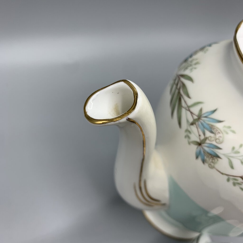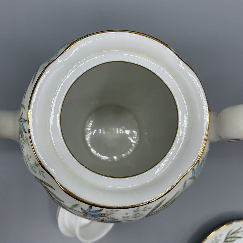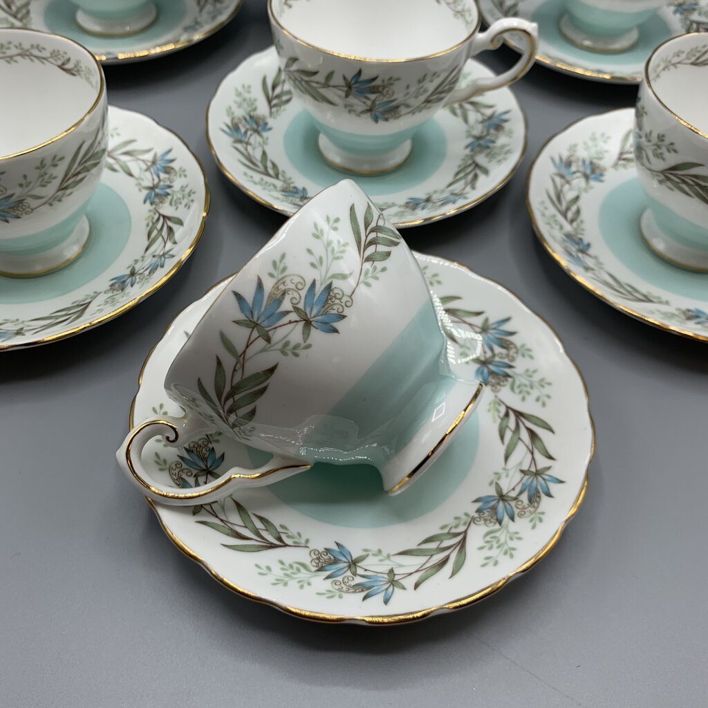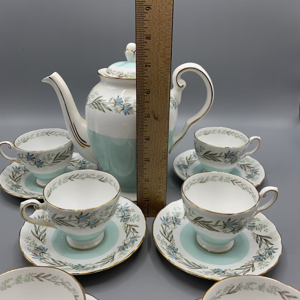 Timeless elegance and charm with this beautiful tea or coffee set made by Tuscan Fine China of Staffordshire, England. The colors and floral garland design are so pretty! This pattern was made pre 1967 because after that Wedgwood bought Tuscan and renamed them Royal Tuscan. I would date this at early 1960s.