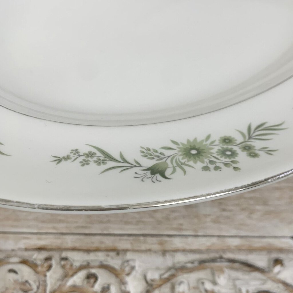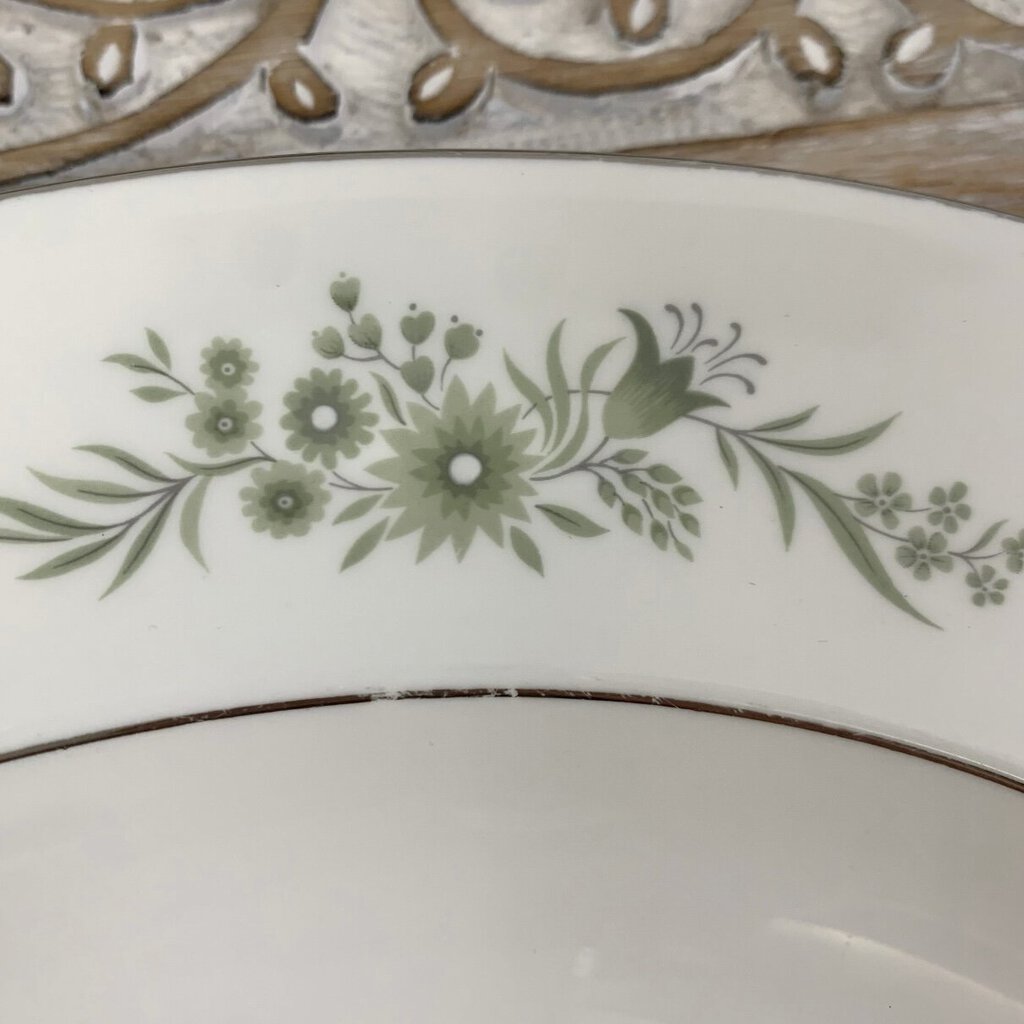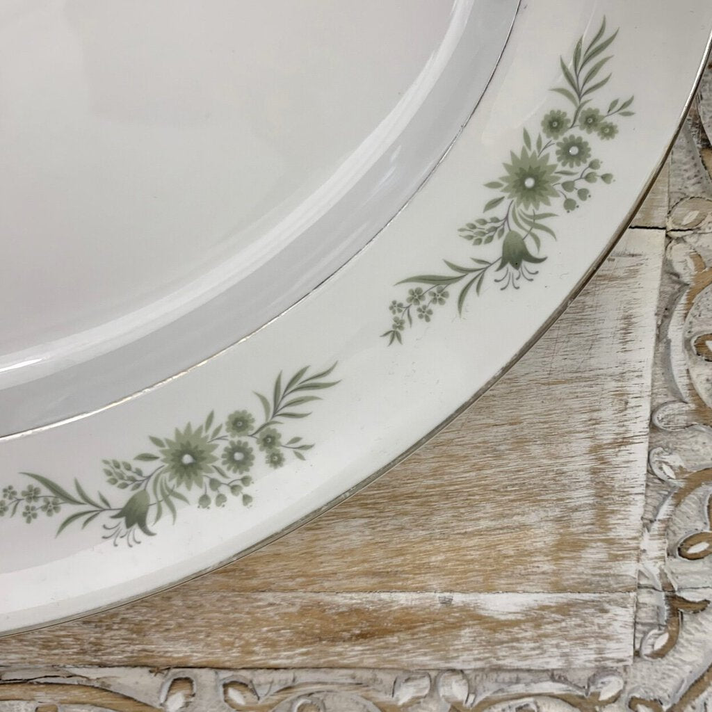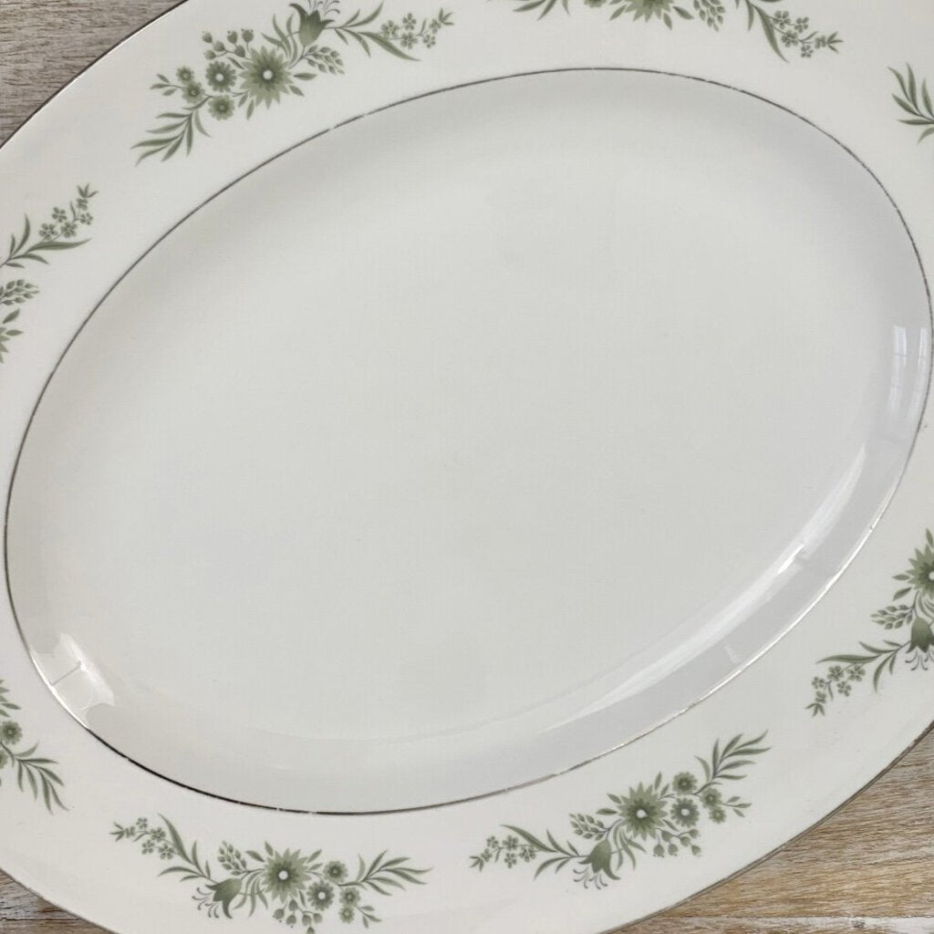 Beautiful vintage serving platter made by Wedgwood, England. The Westbury pattern was produced between 1965-1996. The pattern has charming garlands of sage green flowers accented by a platinum rimmed edge. It measures 13 3/4 inches x 10 5/8 inches. The platter was estate-owned and is in good vintage condition. It has areas where the platinum accents have faded or worn off a bit and some minor scratches from utensil use. Please carefully review the photos for condition details.