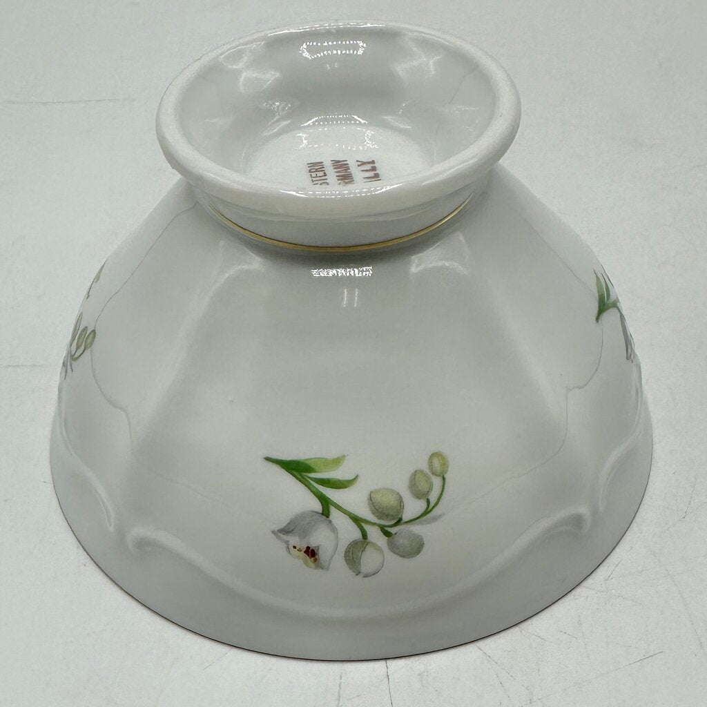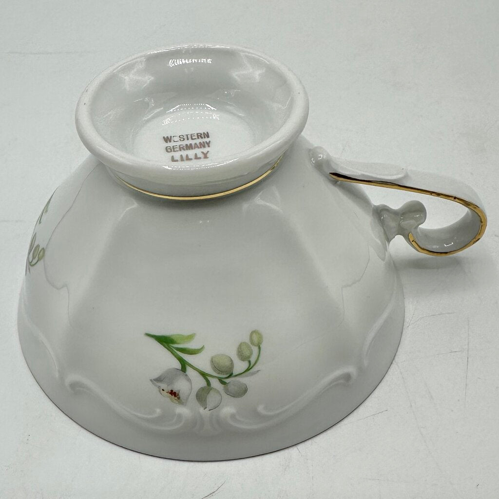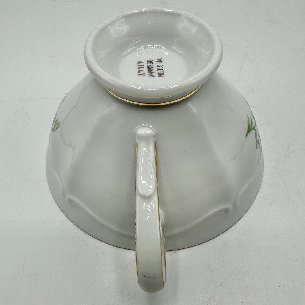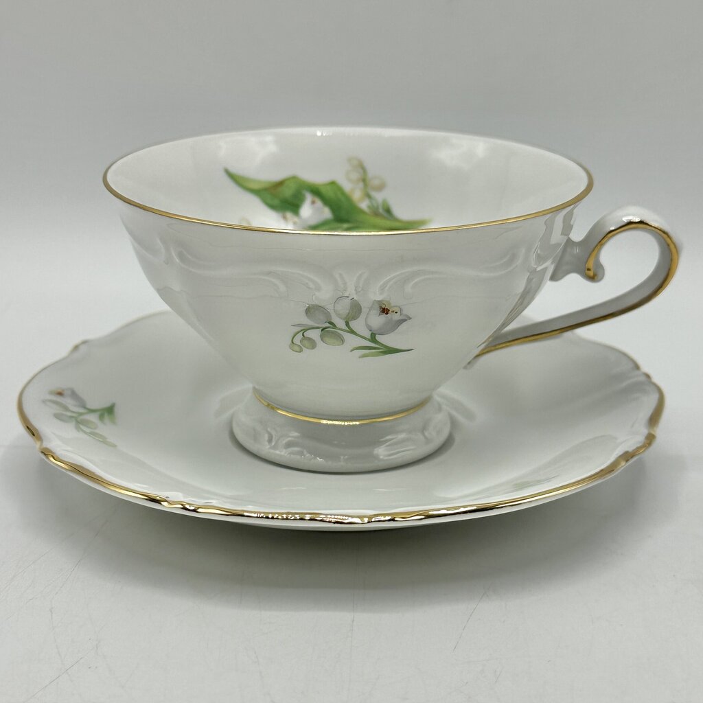 Indulge in the elegance of afternoon tea with this lovely vintage Winterling Kirchlamitz, Bavaria LILLY 3 piece set. The backstamp dates these pieces to 1950-1990. Includes a footed tea cup (2 1/12” tall, 4 1/8” diameter), matching saucer (5 3/4”) and dessert plate (7 1/2”). They feature delicate sprigs of Lily-of-the-Valley on beautiful white embossed porcelain with gold trim. This listing is for one 3 piece set, more are available for purchase. In very good vintage condition, no chips, cracks, crazing or repairs. Please carefully review the photos for details.
