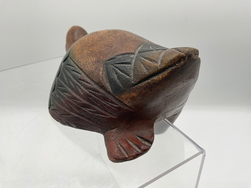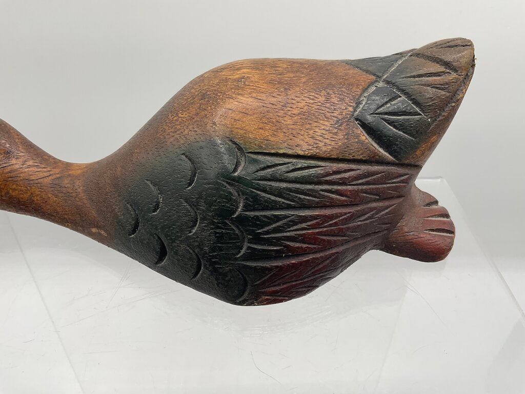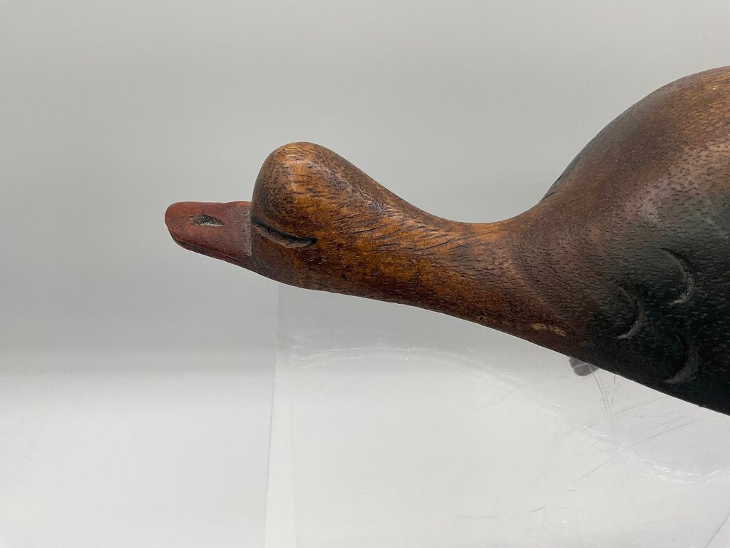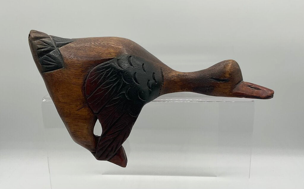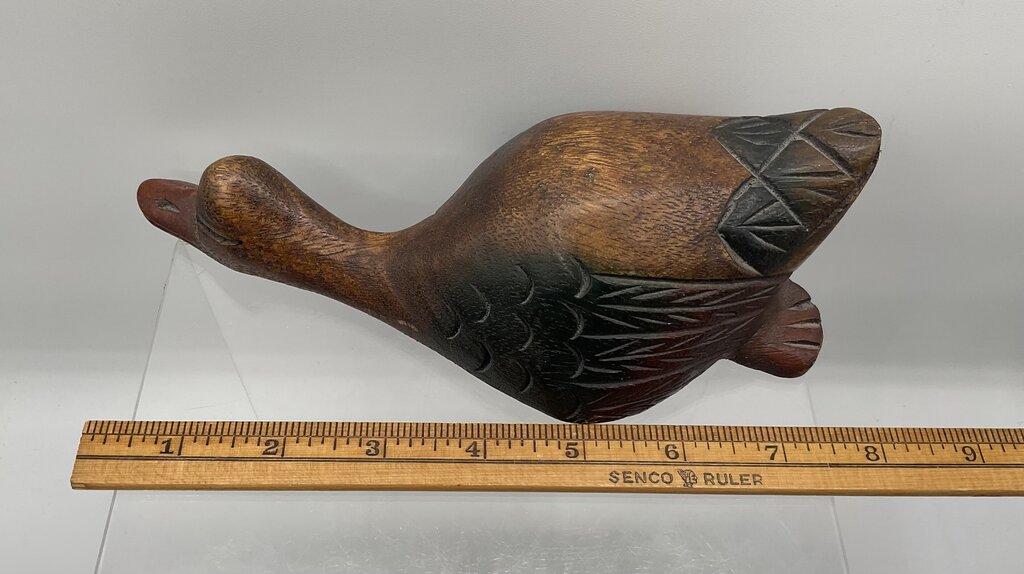 This sleeping duck sits on the edge of a shelf or table and was hand carved and painted. This duck adds a touch of whimsy and charm to any setting. Duck is in fantastic vintage condition, please carefully review all photos for overall condition. Duck measures roughly 8” long by 3 3/4” wide and weighs 6.5 ounces. Estate item. Condition is pre owned. Ships USPS Ground Advantage Mail.