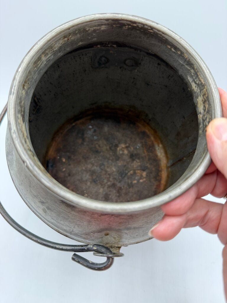 Vintage metal Milk Jug with handle, no lid, 4 quart size. Measures 8.25” tall, 5” in diameter opening and 6.75” in diameter base. Front side reads LIQ 4 QT.. light marks in metal from age and use. No holes in bottom.