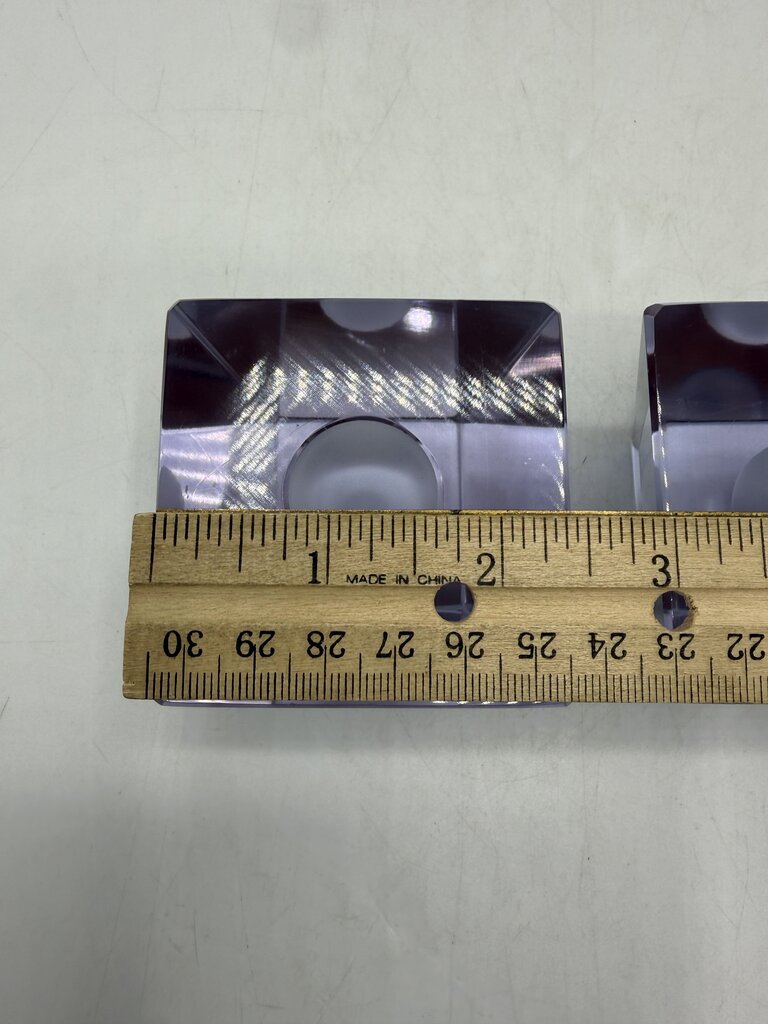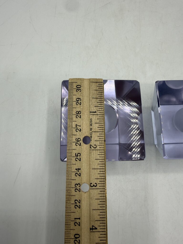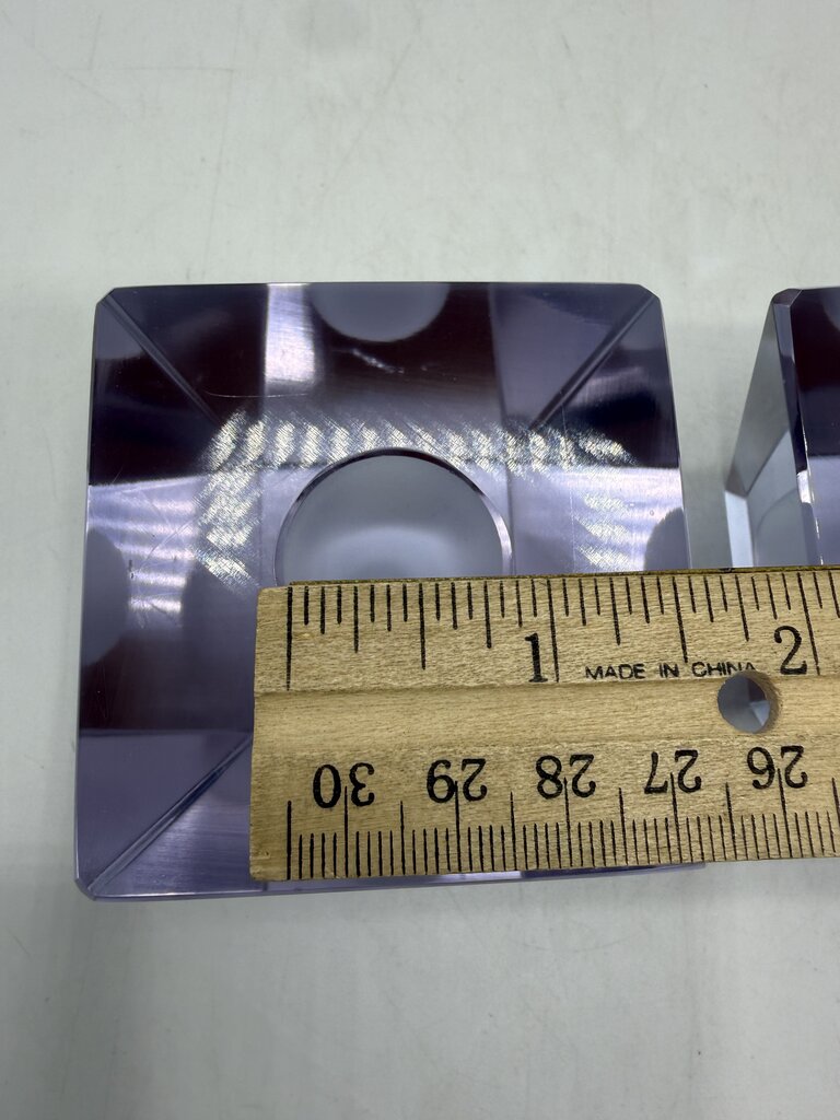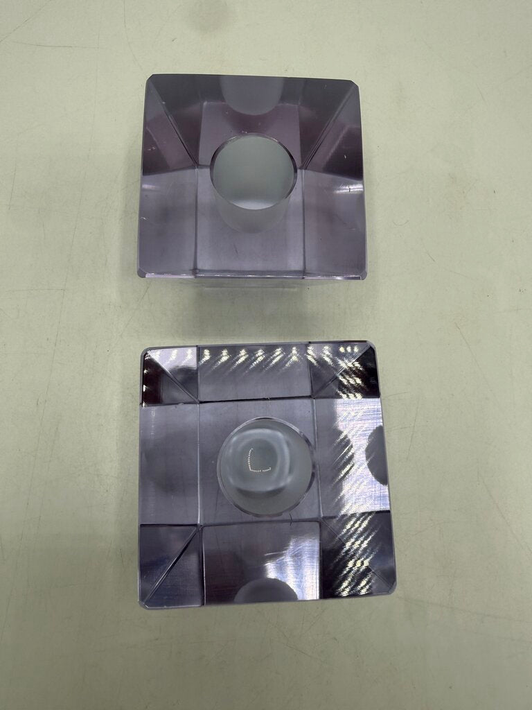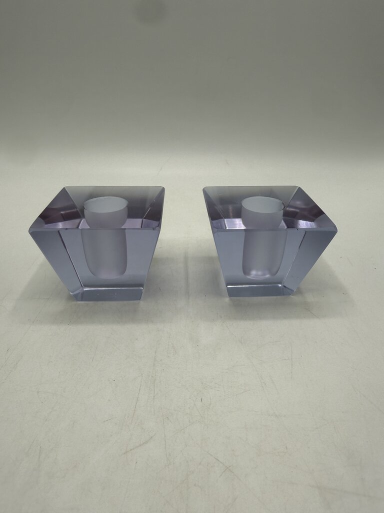 Vintage set of 2 matching heavy crystal glass candlestick holders in an obelisk style shape. The glass is clean and a light lavender color. The top measures 2.5” x 2.5” inch square and slant down to a 1 7/8” x 1 7/8” inch square base. The receptacle hole to hold your candle is 3/4” in diameter. They stand 2” tall and weigh 1 lb. 5 ounces. A few light marks from use, no chips or cracks. Very unique and attractive at to enhance any room of your home.