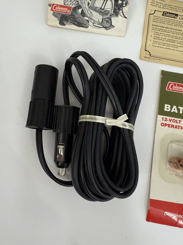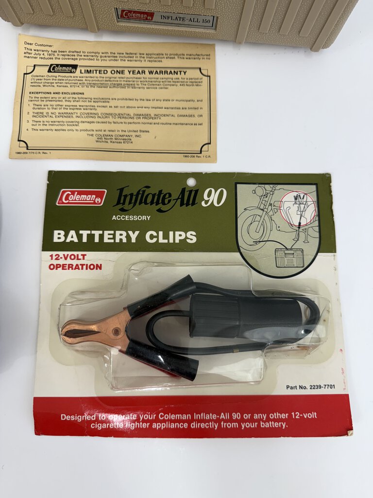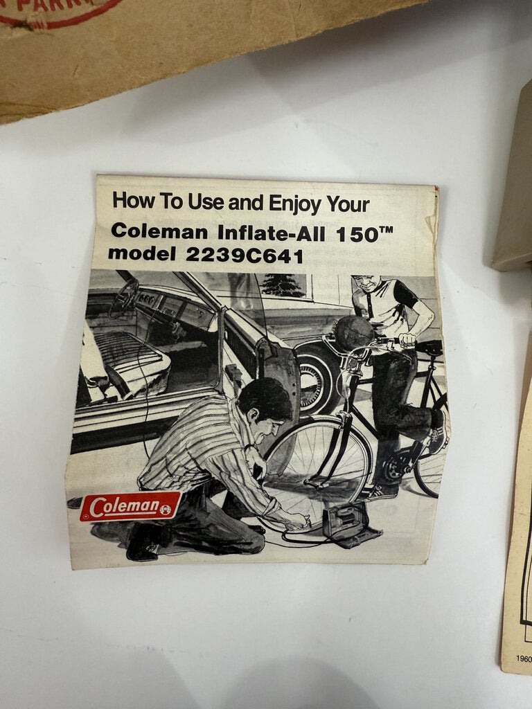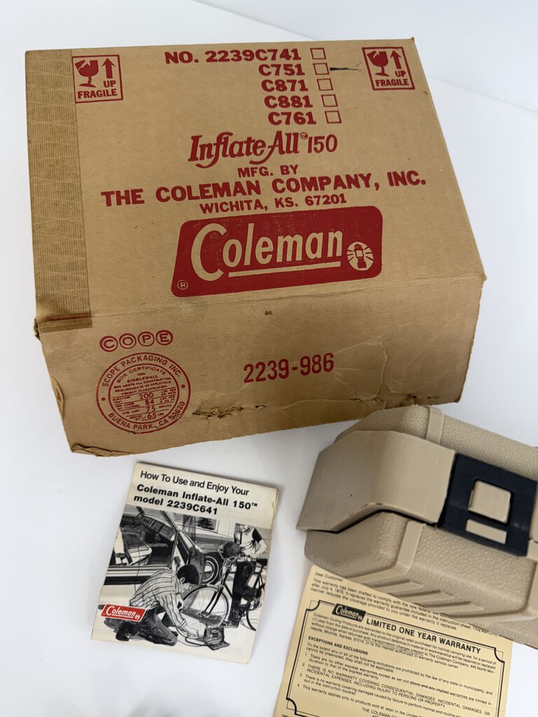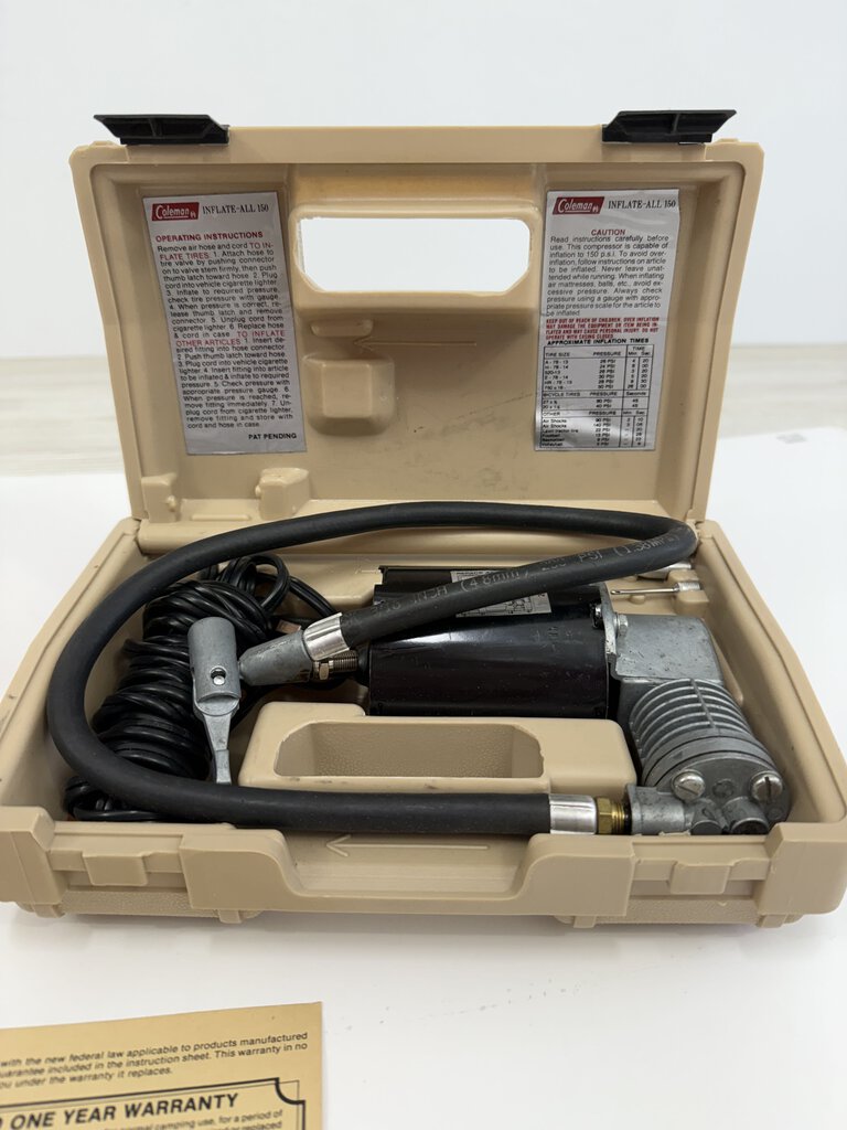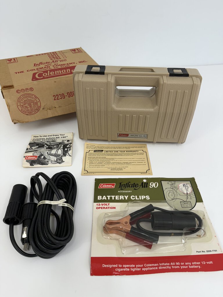 Vintage Coleman Inflate-All 150 Model 2239C641 in original storage carrying case with cigarette lighter adapter and Inflate All 90 accessory batter clips. Untested.