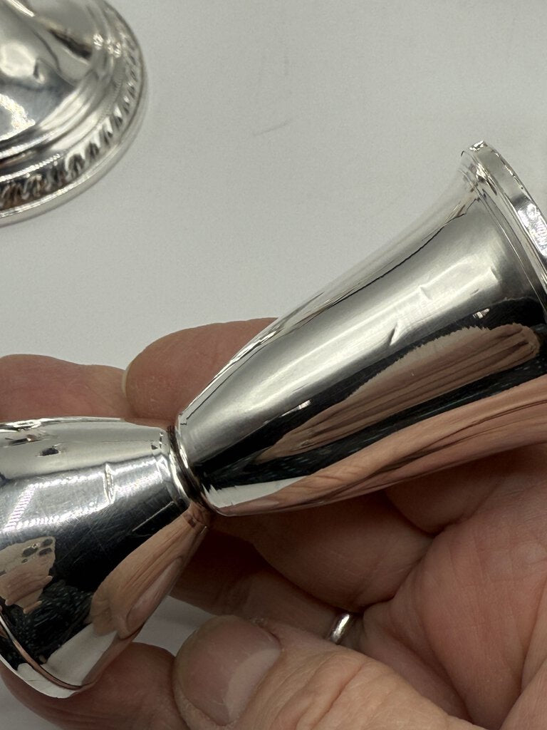 MEASUREs approximately 9.5" TALL AND 9.5" WIDE. AS SINGLE, THEY MEASURE 3.75" TALL the middle section is 4” tall. Combined weight of set is 3 lbs.. This elegant six piece set has a shiny bright finish with just a few little dings in the fine metal finish.