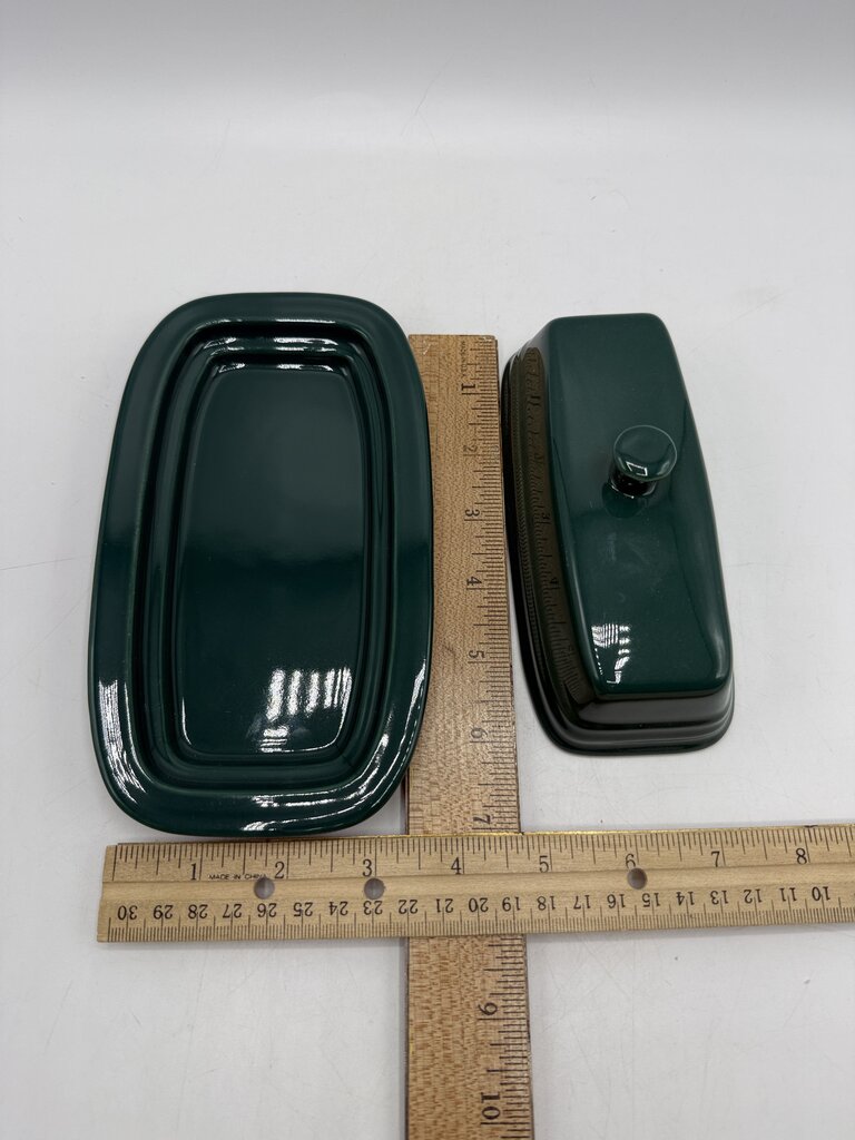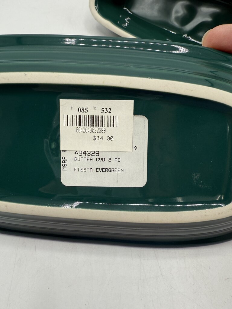 Vintage Fiesta Fiestaware Covered Butter Dish for 1/4 lb stick of butter in Evergreen. Bottom of plate has original sticker, never used. No damage found. Bottom plate Measures: