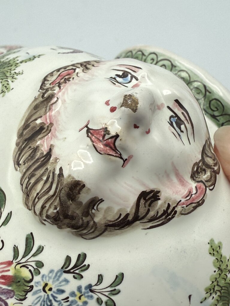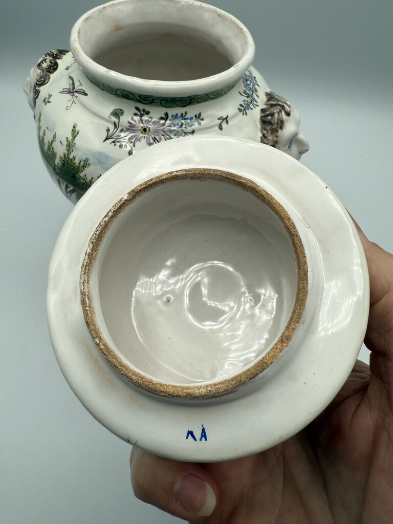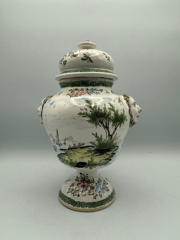 Attractive handpainted ceramic Urn with lid and Lions heads. Urn with lid in place measures 9” tall and approximately 6” across, Lion head to Lion head. Hand painted with in a charming Victorian style of scenery and flowers. A young couple reclines on one side with the man on one knee and while holding his loved one’s hand. One chip is found on a lions nose, no other chips or cracks.