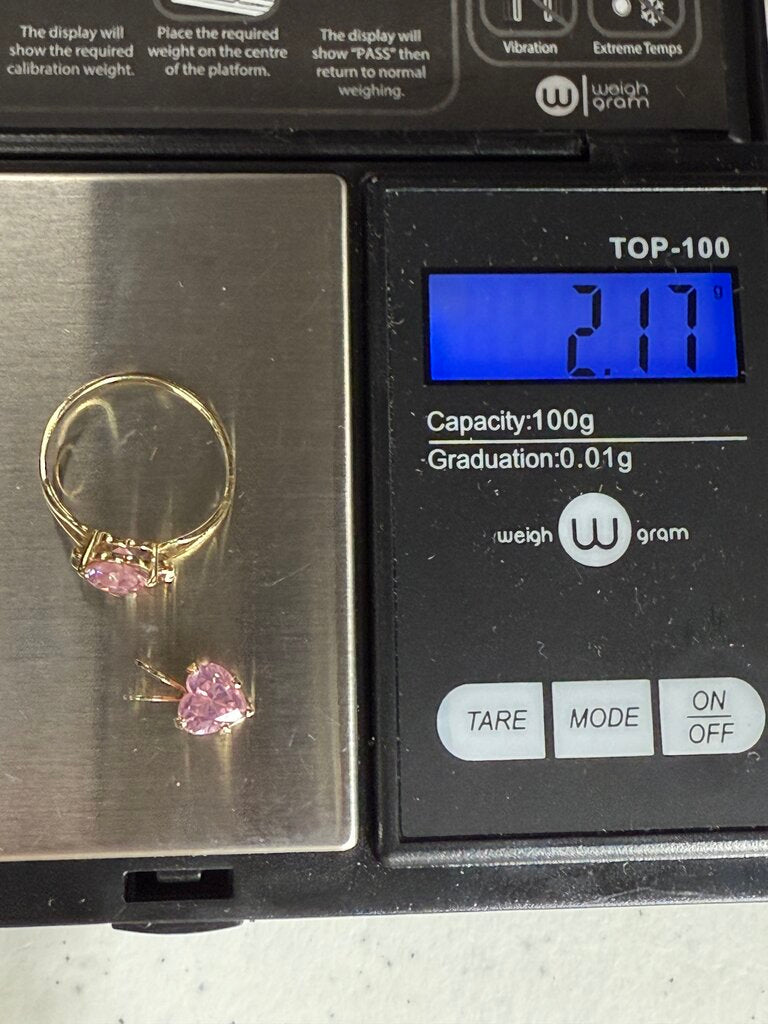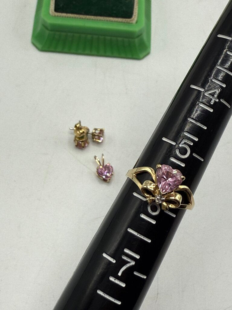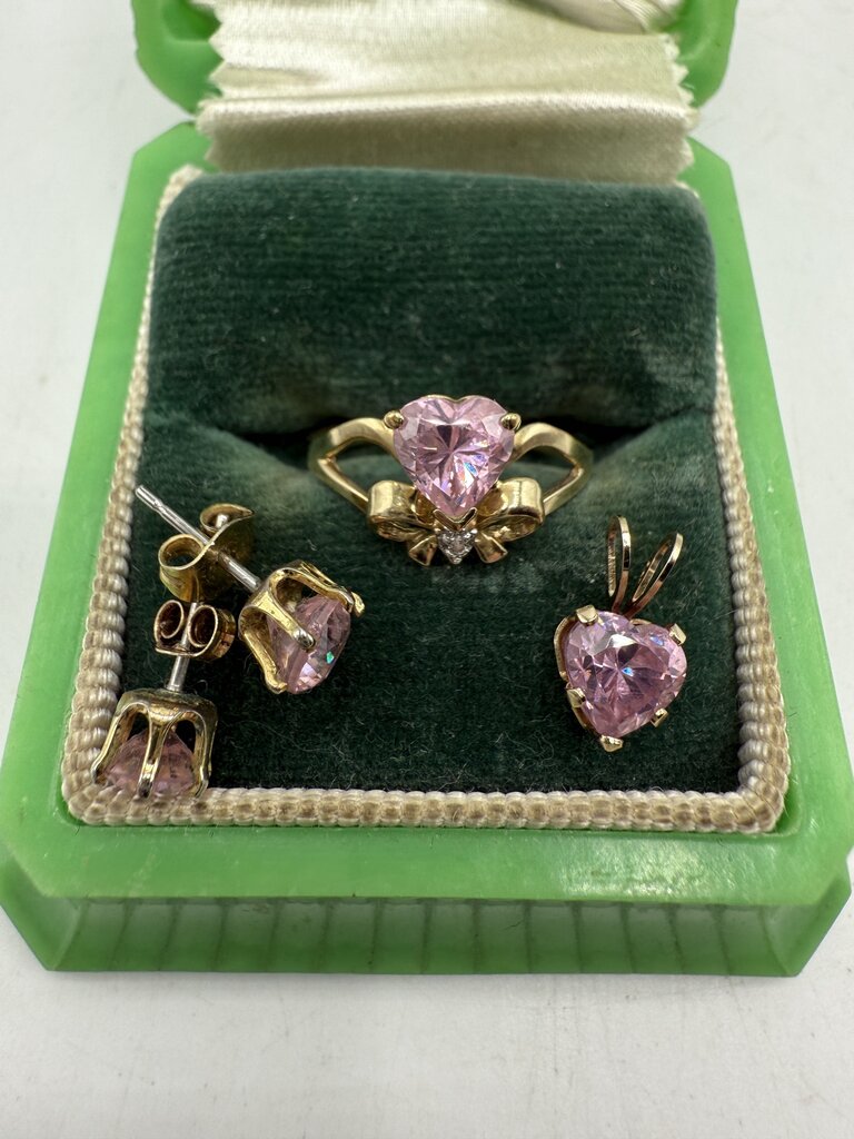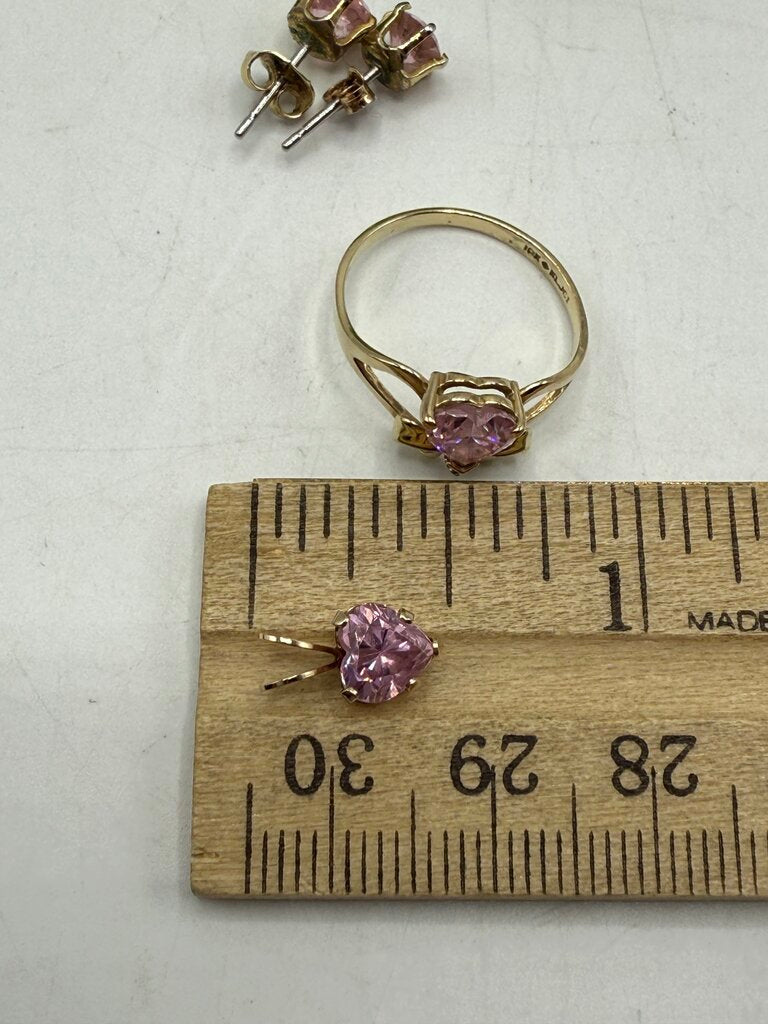 VTG Heart Shape Pink Gemstone Ring 10Kt Pendant 14Kt Pierced Earrings /ro