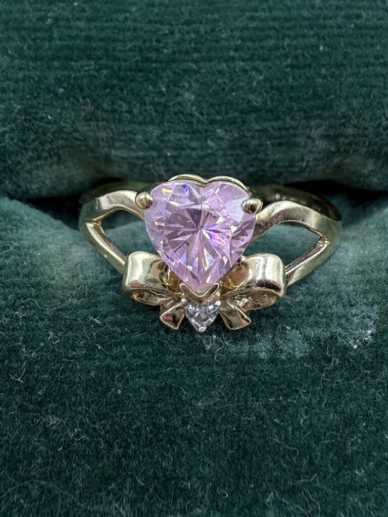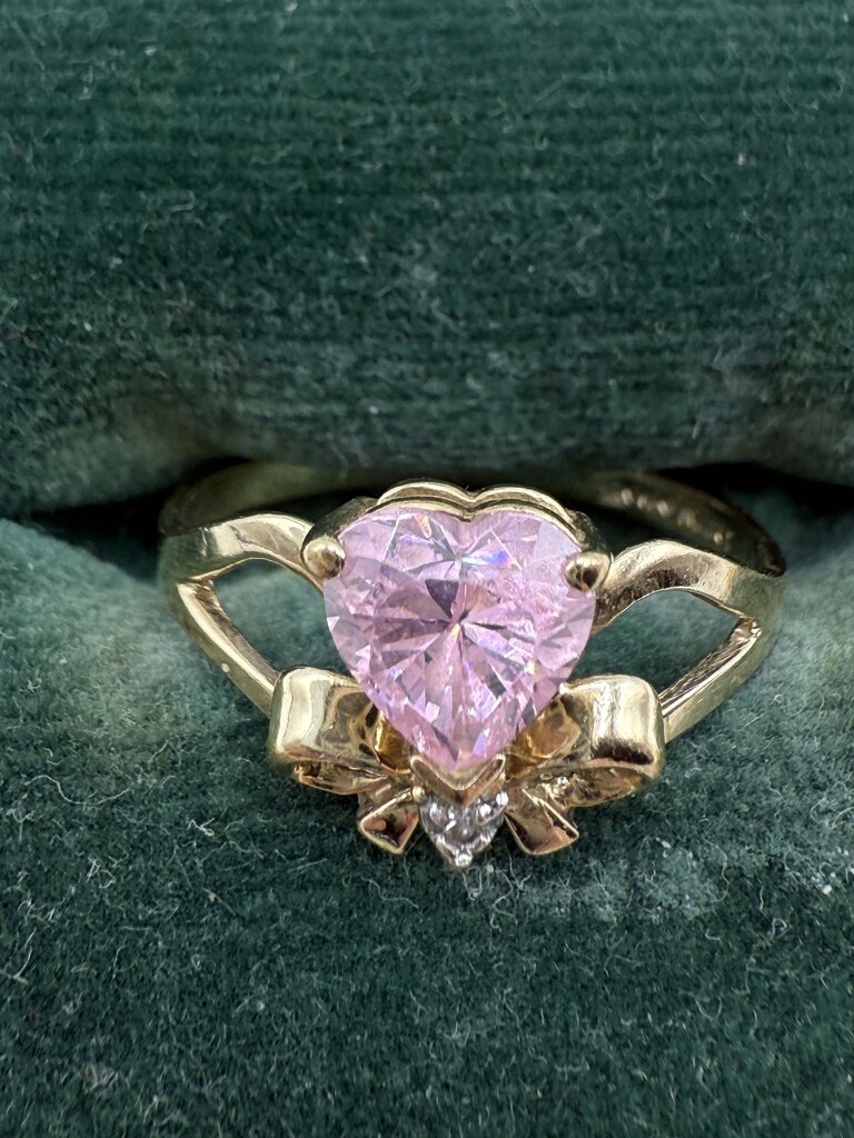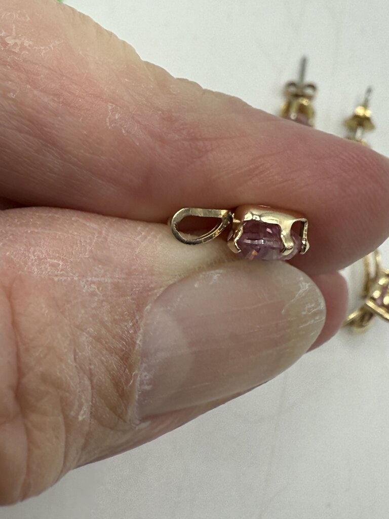 This estate set of pink gemstone jewelry includes a 10 KT Gold ring with a heart shape pink gemstone and an accent tiny diamond in a bow setting. Ring Size 5.5. Also included with this post is heart shape pink gemstone pendant set in 14 Kt gold. And one set of pink gemstone pierced stud earrings gold tone surgical steel. Gram weight of the ring and pendant is 2.17 grams. Lots of sparkle in stones.