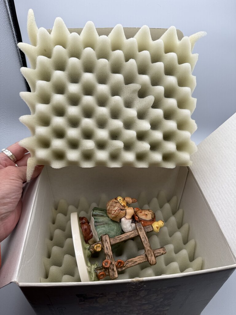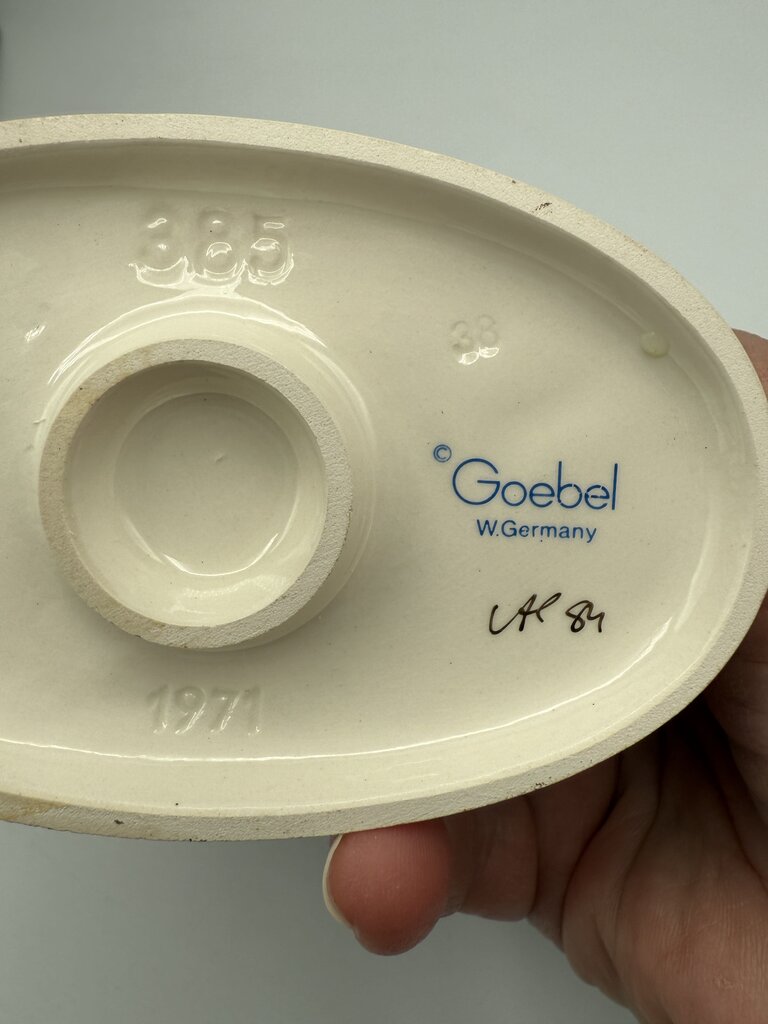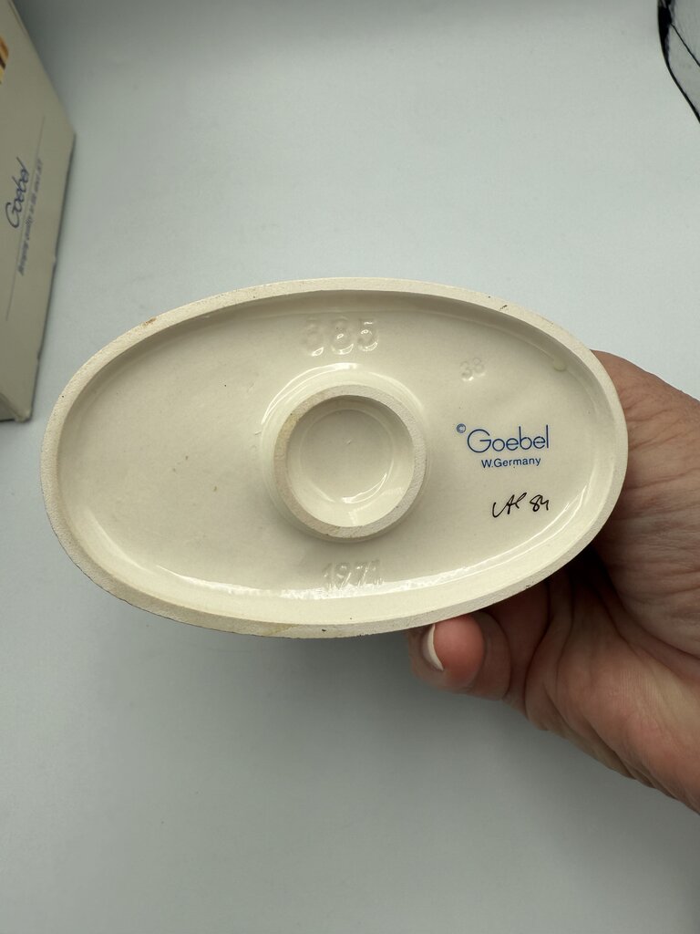 The product is a Hummel Chicken Licken 385 TMK5 Goebel Figurine, measuring 4.75 inches in length. Made in West Germany, this collectible figurine is part of the Hummel collection and comes in its original boxed packaging. With intricate details and no modifications made, this figurine is a charming addition to any decorative collection, showcasing the craftsmanship and quality of German manufacturing. No chips, cracks or dust, clean. |