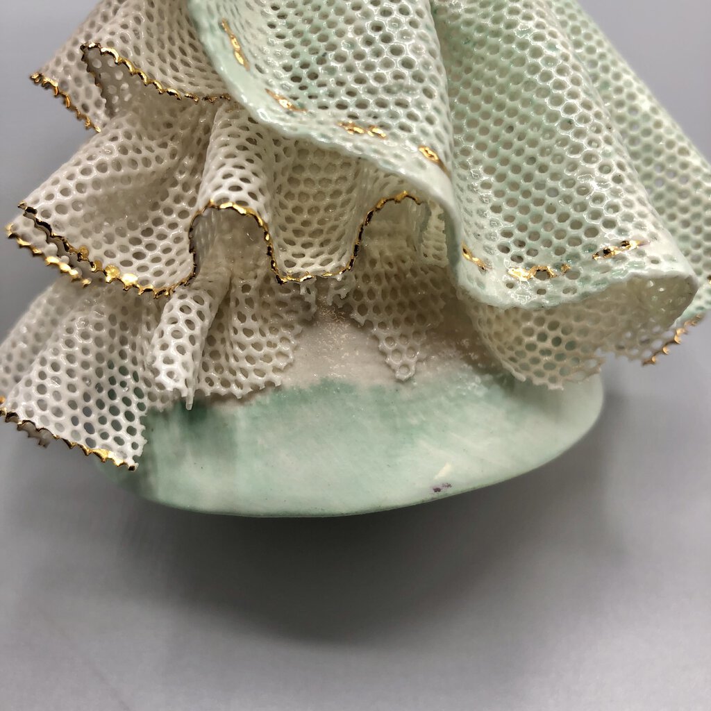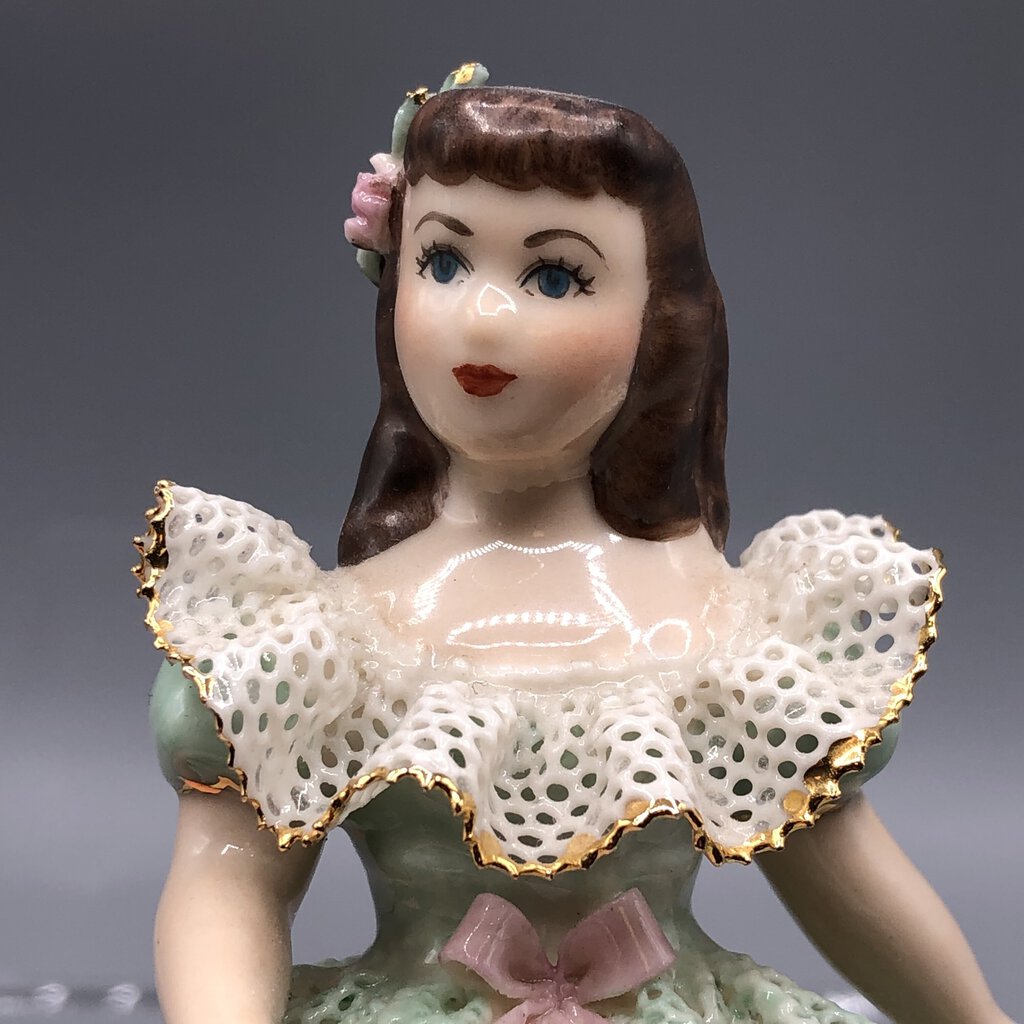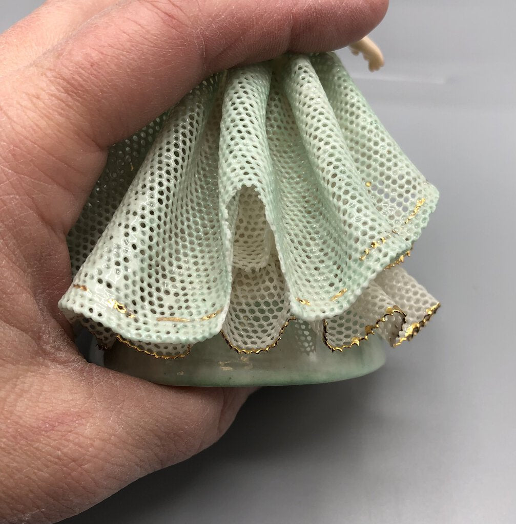 There are two damaged spots to delicate porcelain lace.One side of the bottom white lace and the other side on the green over skirt.