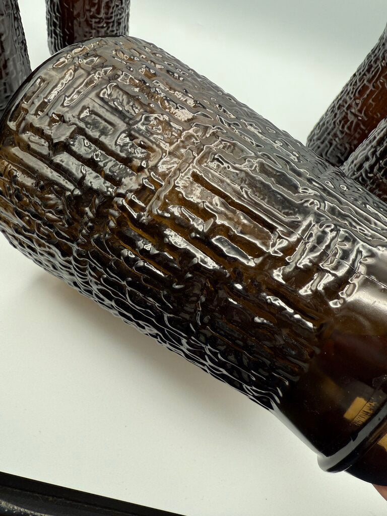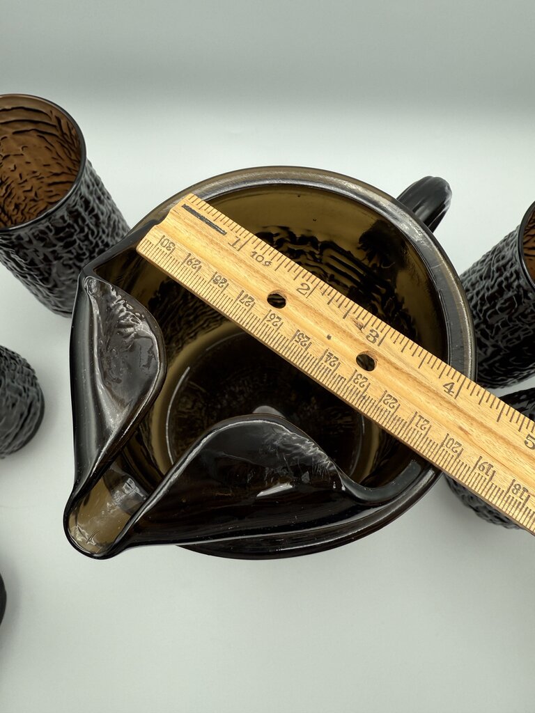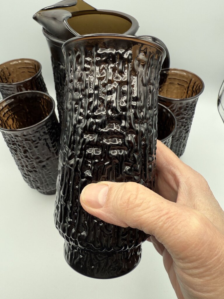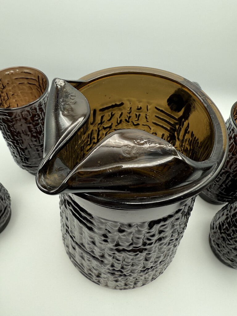 Estate set Libbey pressed glass in the Artica pattern, tawny brown color, beverage pitcher 72 ounce capacity with an ice lip. Five matching glasses that stand 6” tall. No chips or cracks in glass. From the 1970’ies.