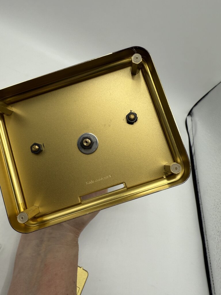 This beautiful Loricron Quartz Clock is a vintage piece that will add a touch of elegance to any room in your home. Made in Germany, it features a rectangle shape and a gold finish, with Roman numerals on a gold tone face. The clock is battery-operated and has a height of 6.5 inches and a width of 4 inches, and 3” deep, making it perfect for display on a shelf or desk. Working Condition with one AA battery, battery not included in sale. One small white dot, looks like sticker residue. |