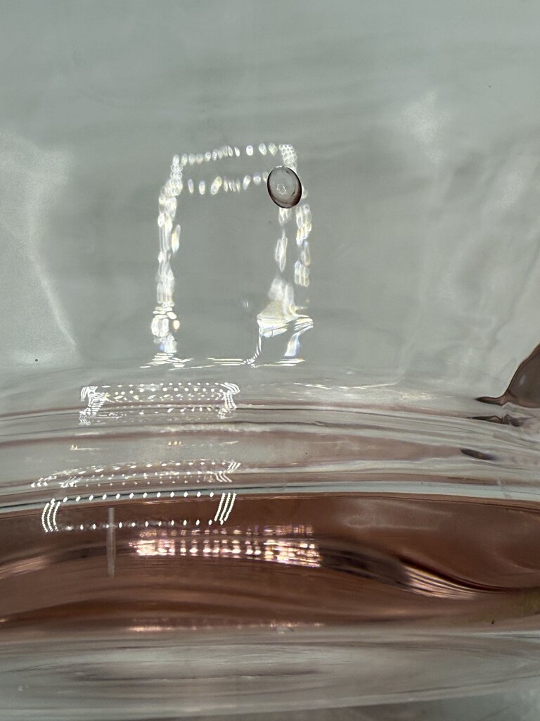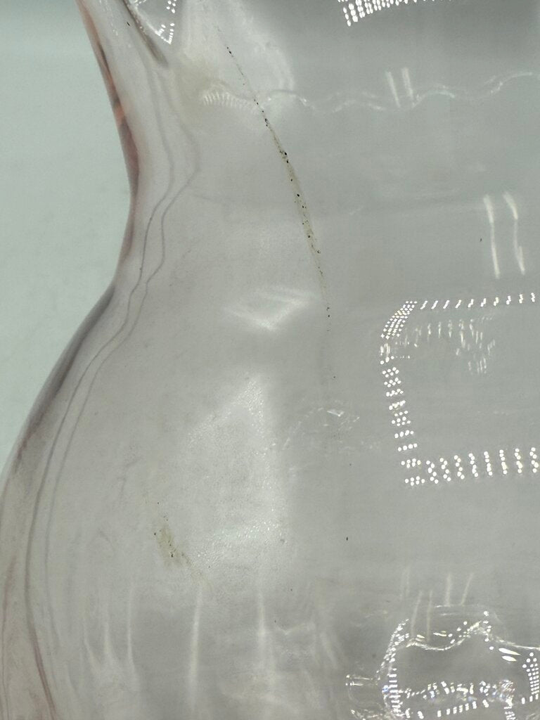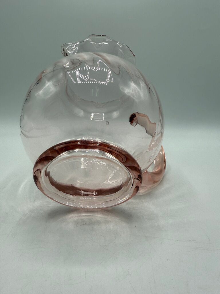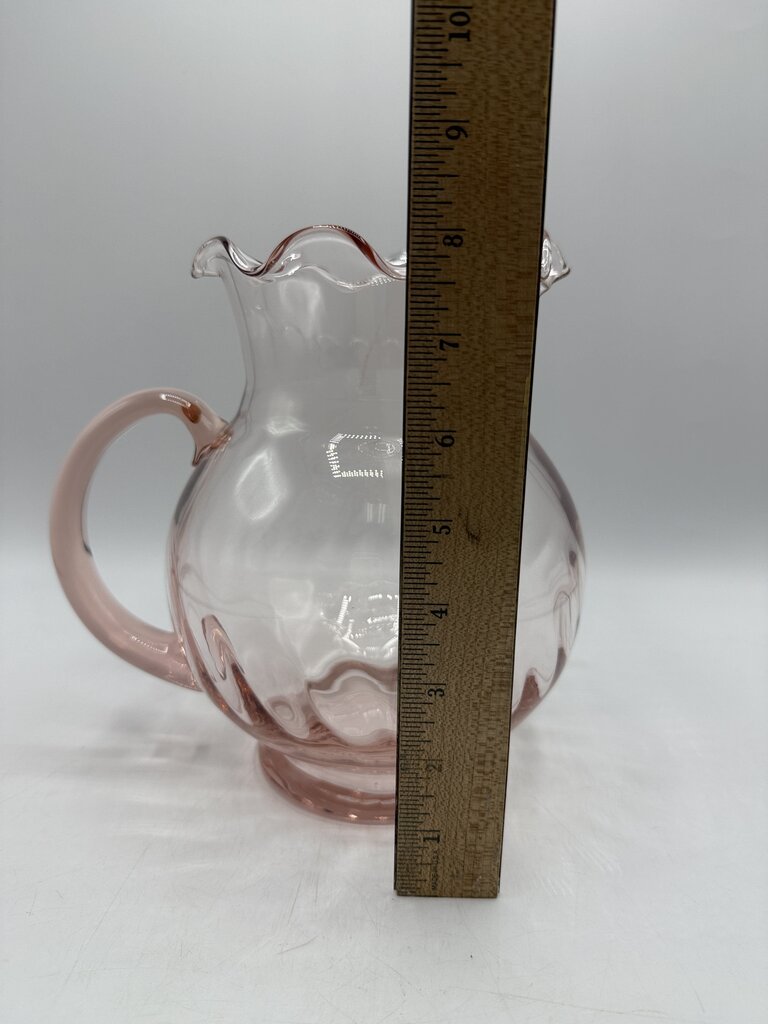 Unique vintage pink optic glass water pitcher with a ruffled edge opening. Stands 8.5” tall with a 5” opening. No chips, cracks or cloudiness in glass. There are two lines in glass from manufacturing.