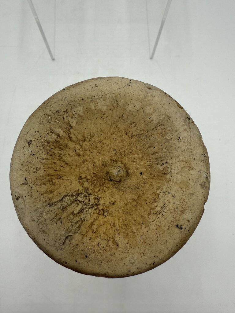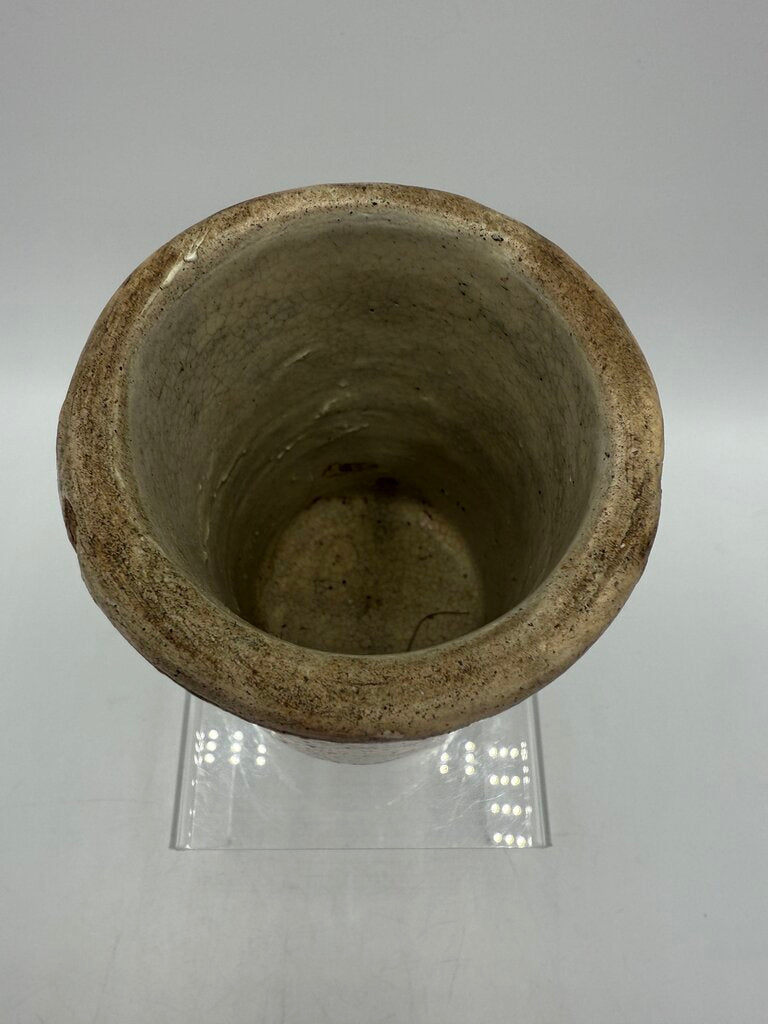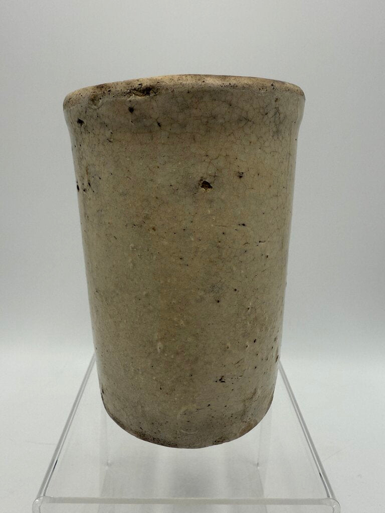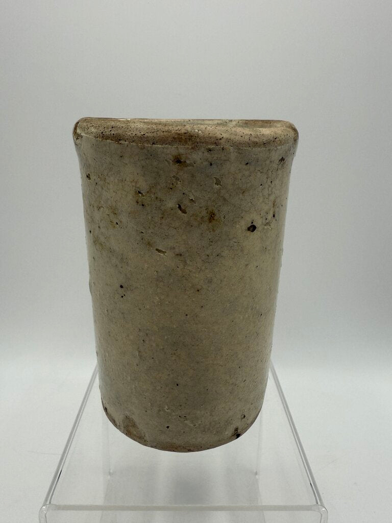 Antique primitive small stoneware crock with a beige salt glaze. Stands 5” tall and 3” in diameter. Lots of character from age.