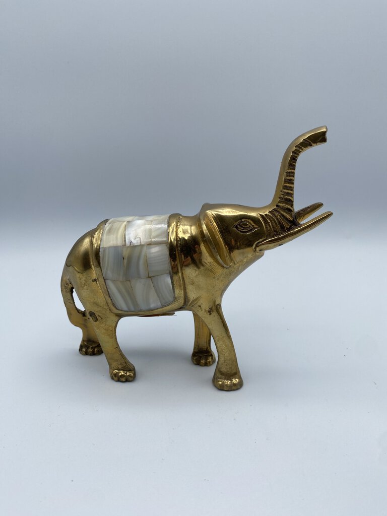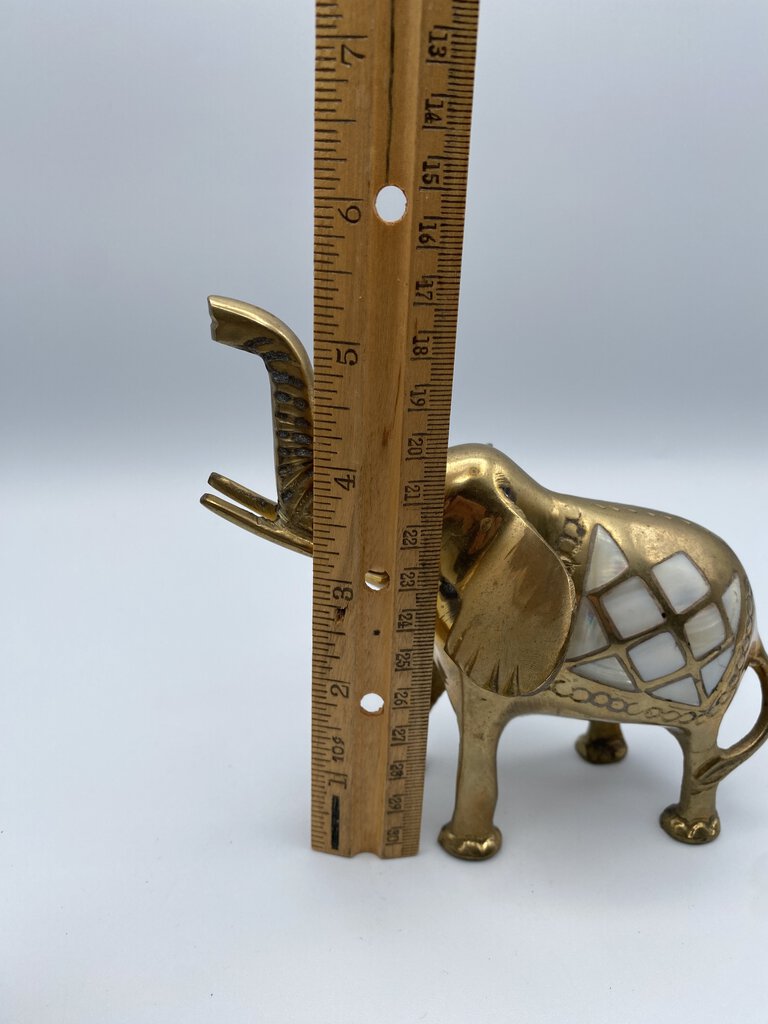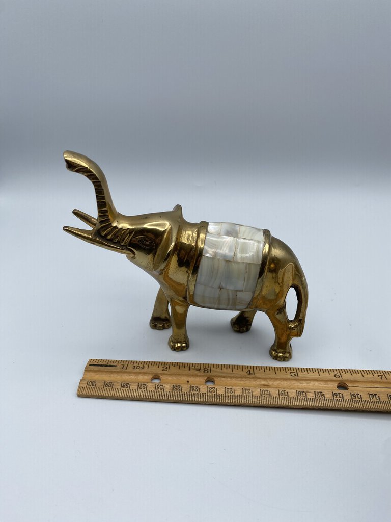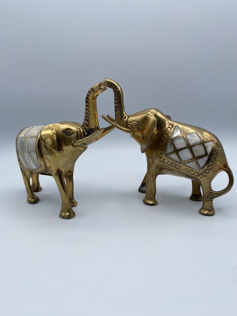 Charming set of 2 Brass Elephants with their trunks lifted up for luck! Vintage set of Elephants with inlaid Mother-of-Pearl saddles. They measures approximately 6” in length and 5.5” tall to the top of their trunks. Made in India.