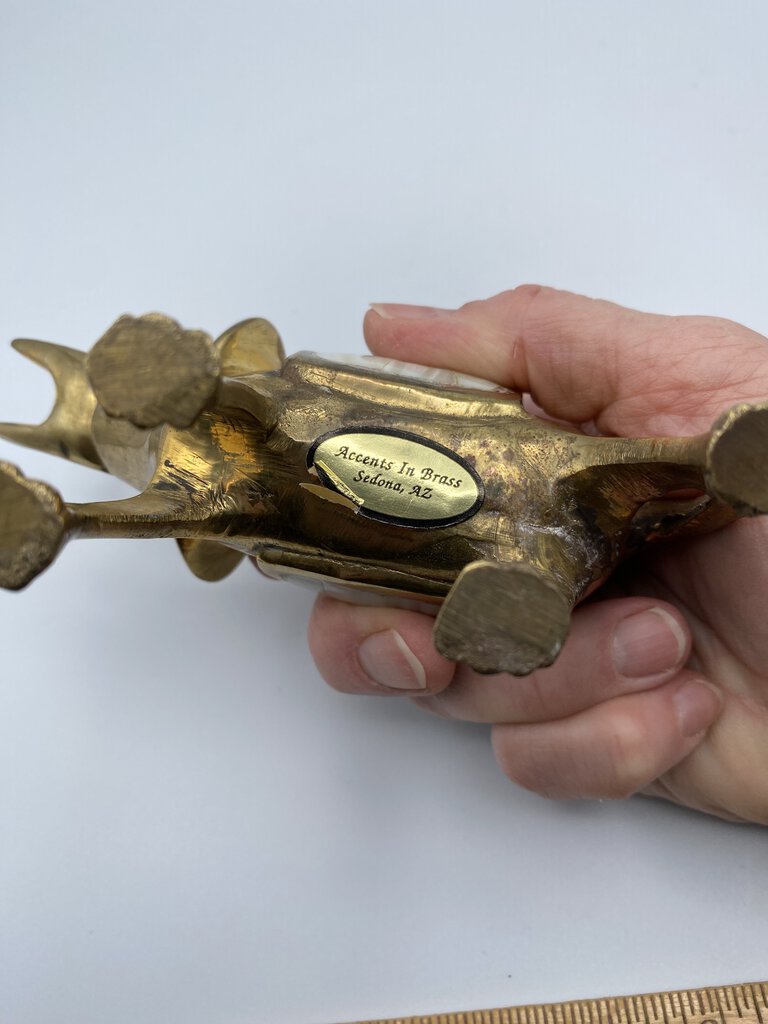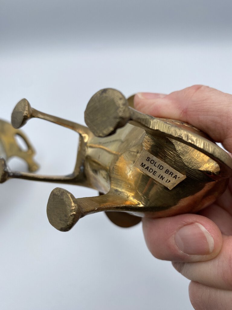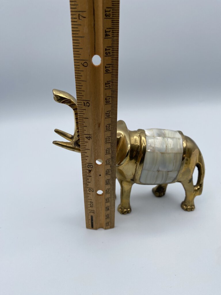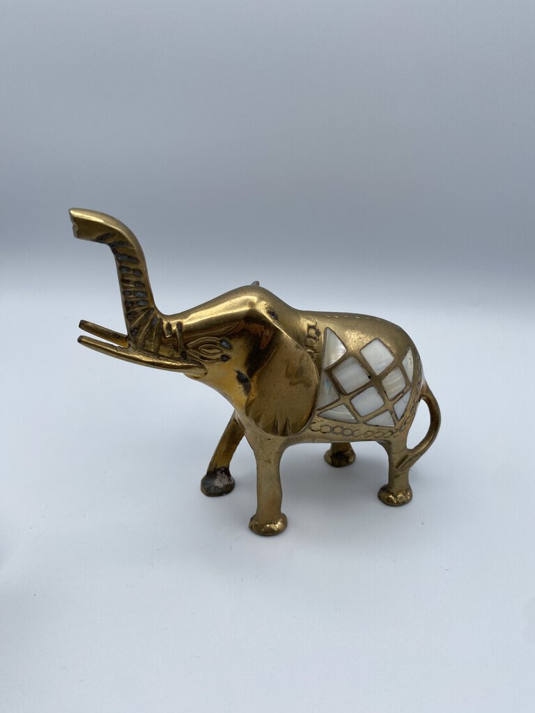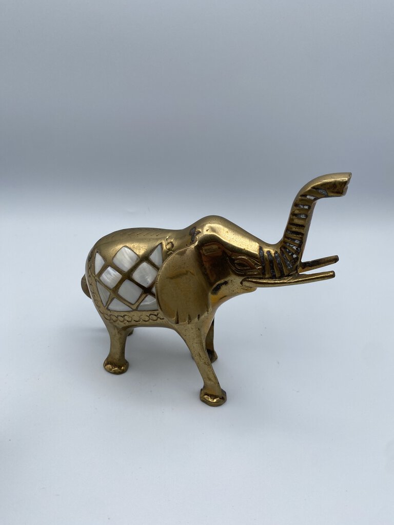 Charming set of 2 Brass Elephants with their trunks lifted up for luck! Vintage set of Elephants with inlaid Mother-of-Pearl saddles. They measures approximately 6” in length and 5.5” tall to the top of their trunks. Made in India.