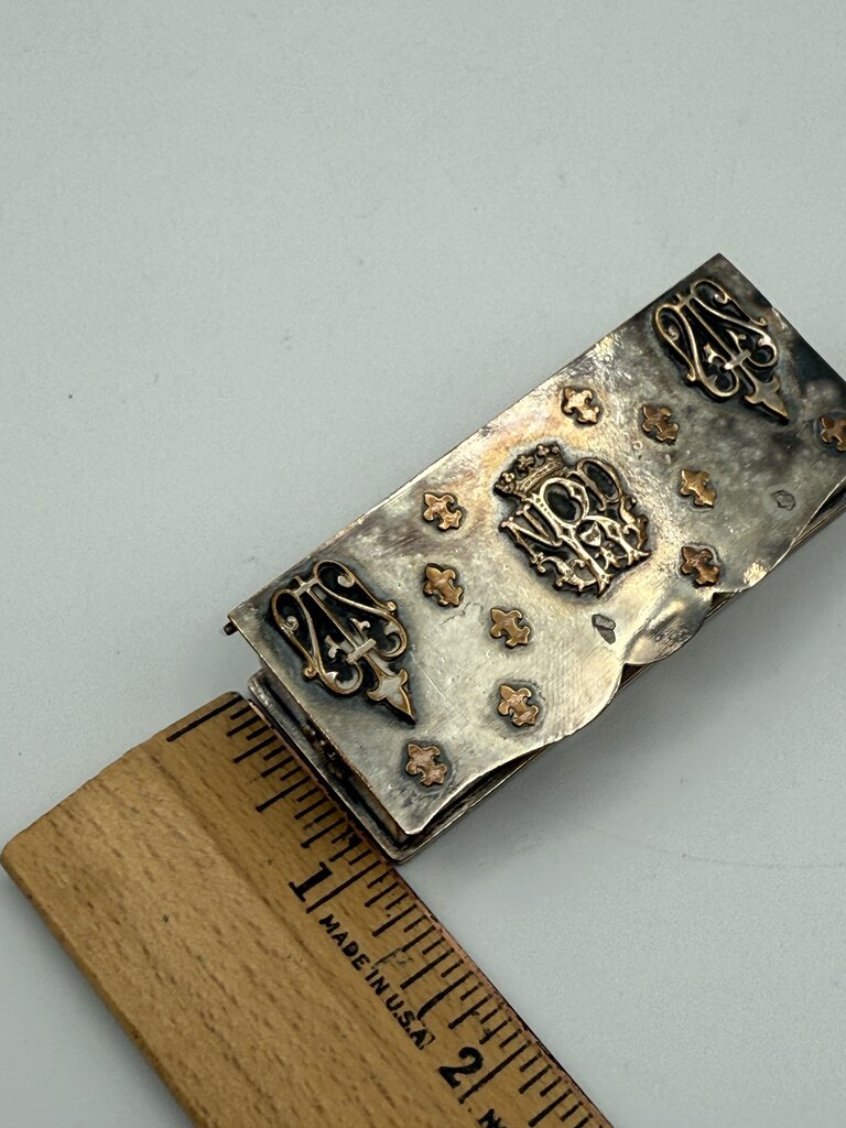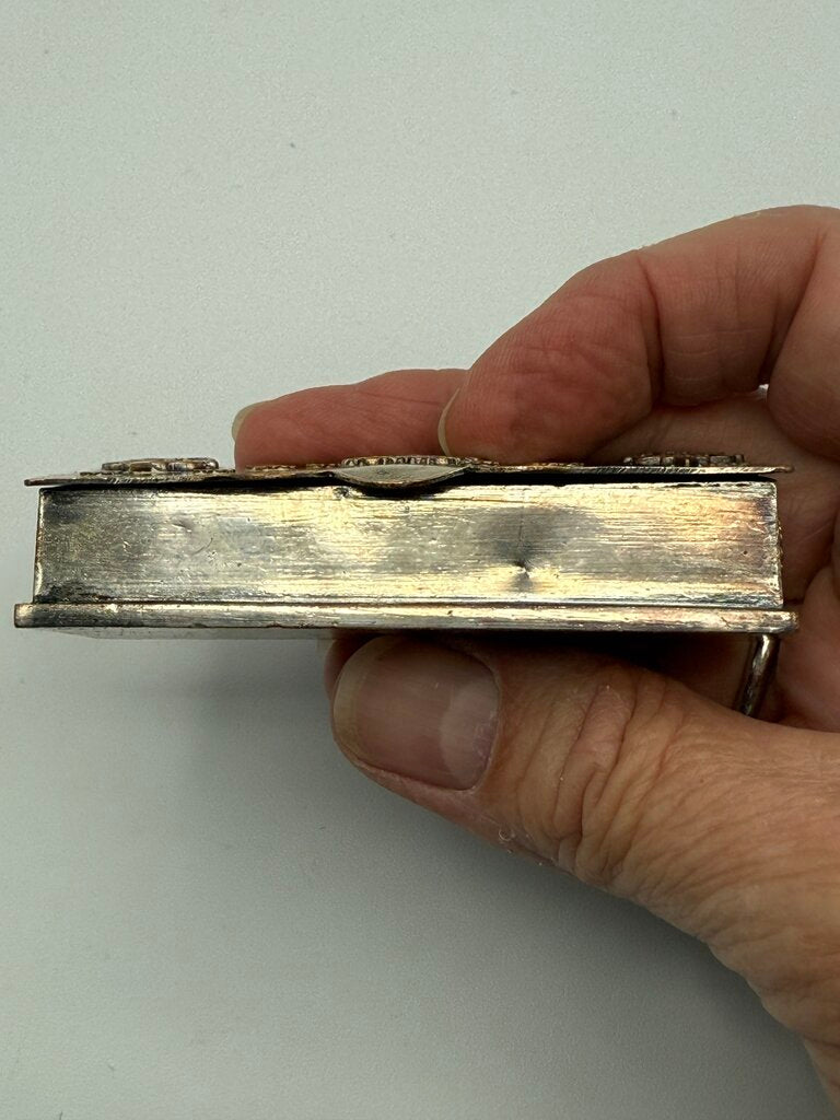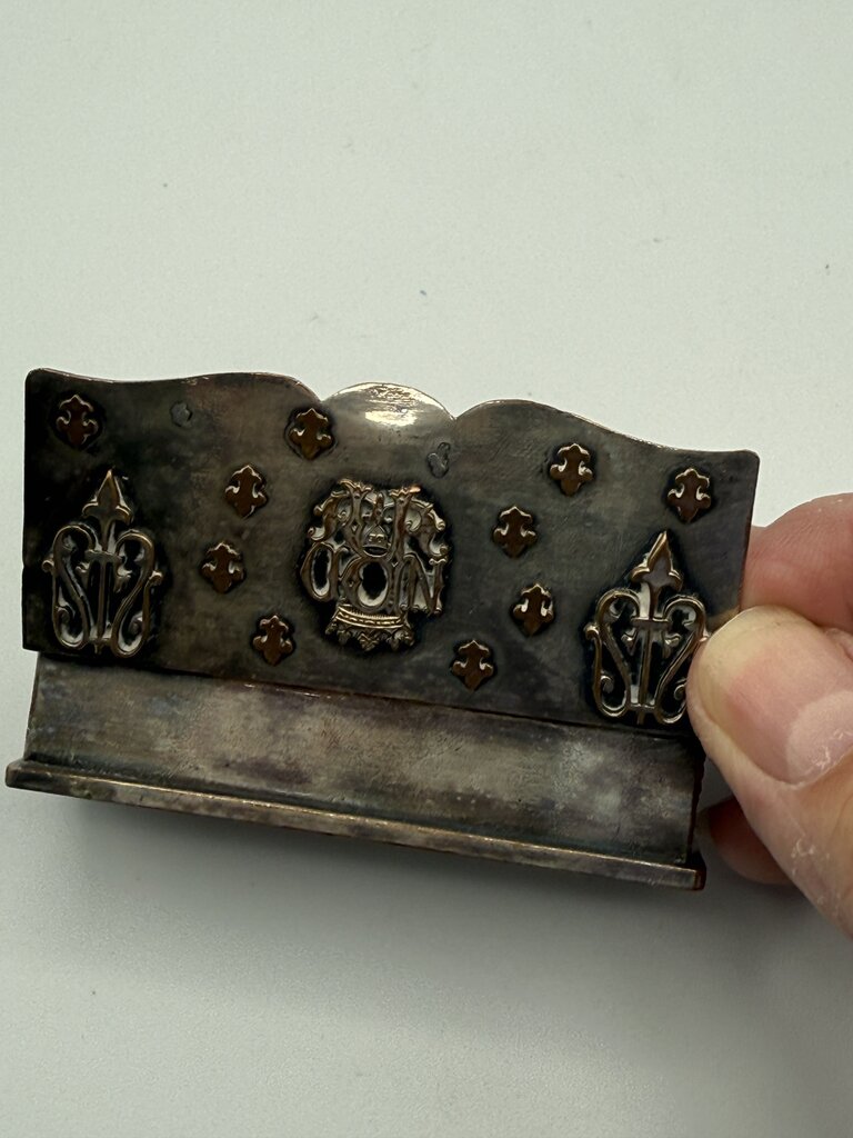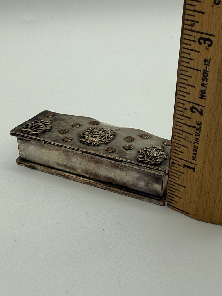 Unique estate item, this silver plate postage stamp box or pill box measures 3” x 1.25” and .75” deep. Box lid has the raised crest letters of N R D in center complimented by two harp like raised designs on either side. Some wear of silver plate. One small dent on front of box.