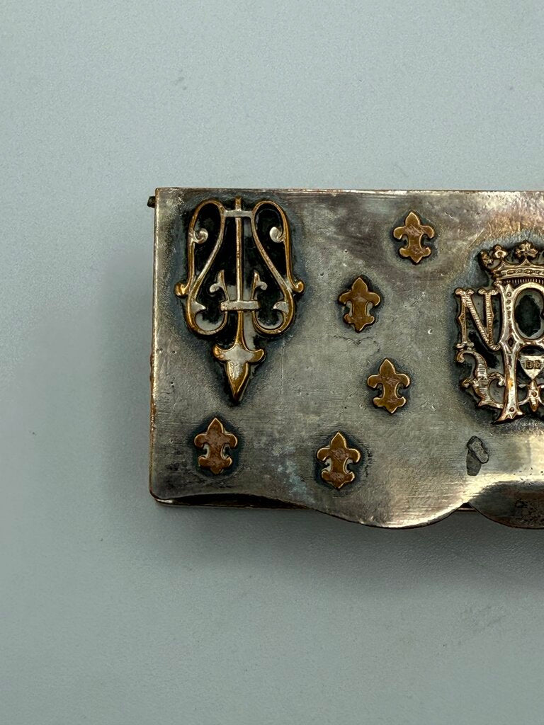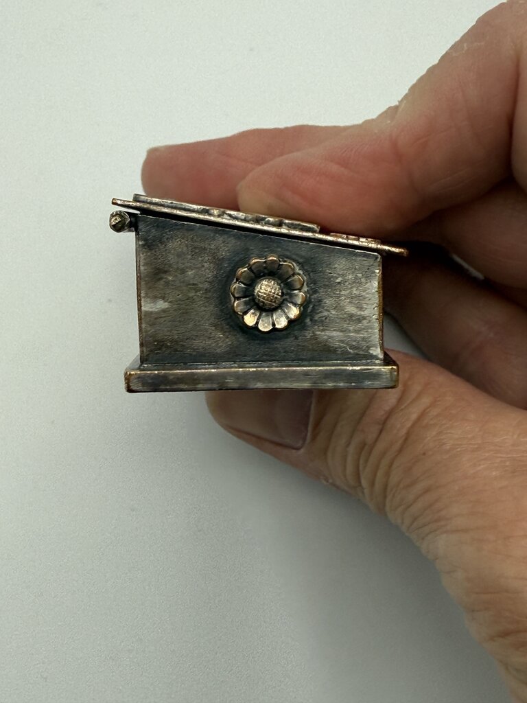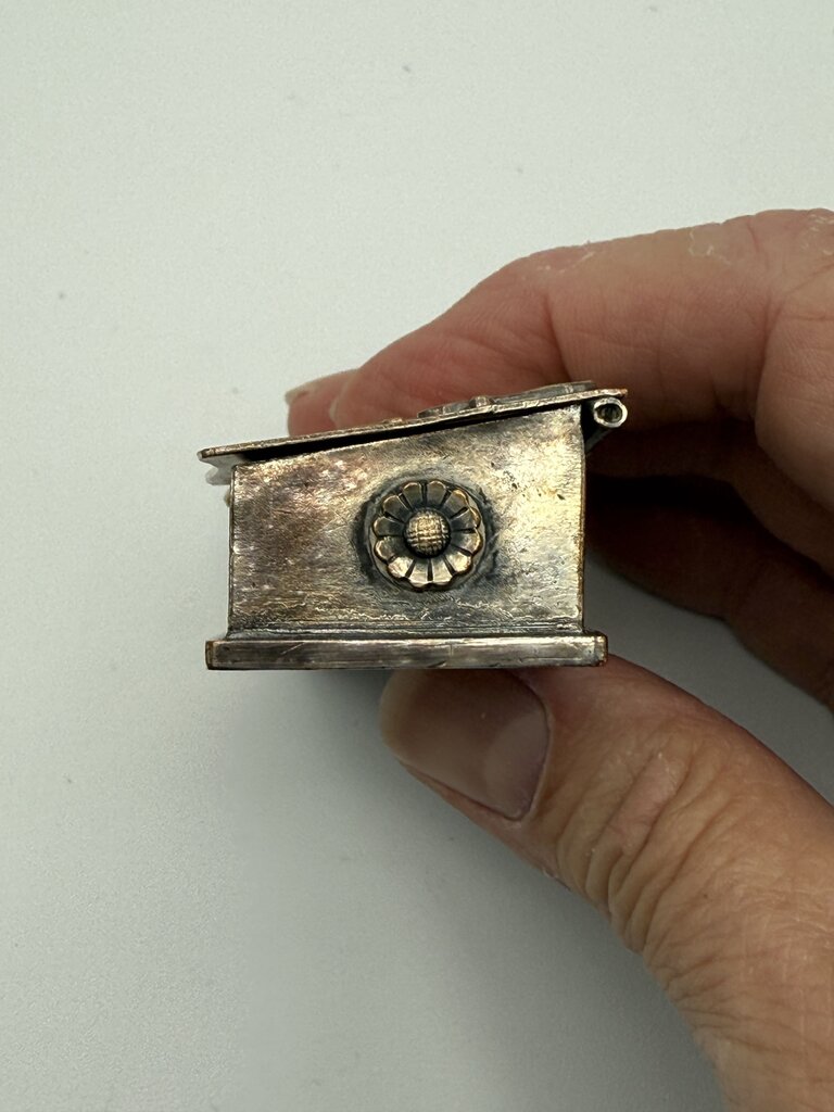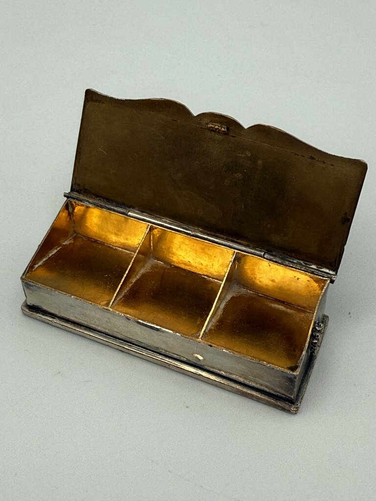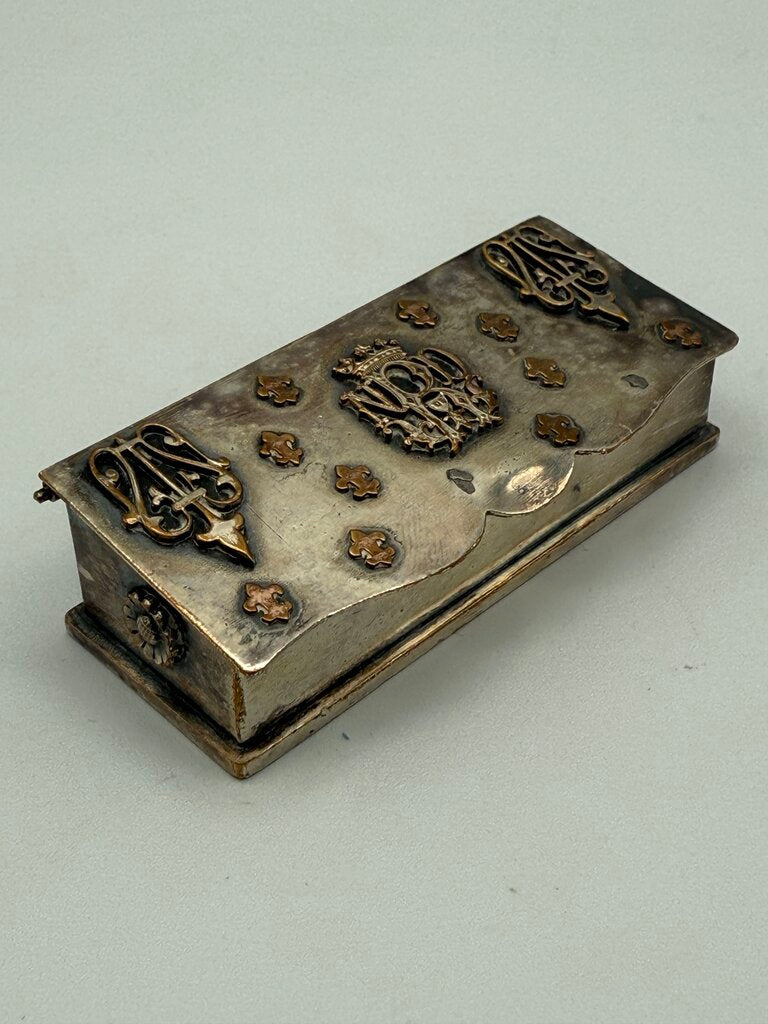 Unique estate item, this silver plate postage stamp box or pill box measures 3” x 1.25” and .75” deep. Box lid has the raised crest letters of N R D in center complimented by two harp like raised designs on either side. Some wear of silver plate. One small dent on front of box.