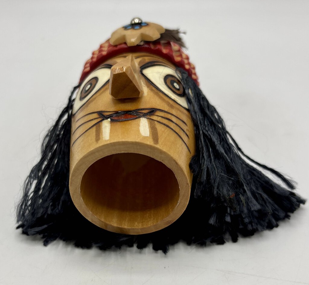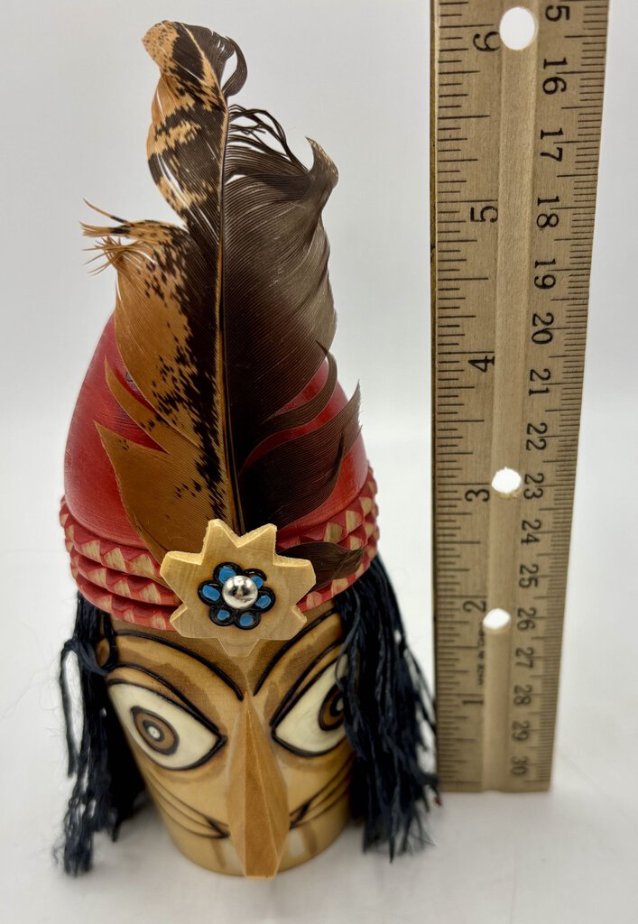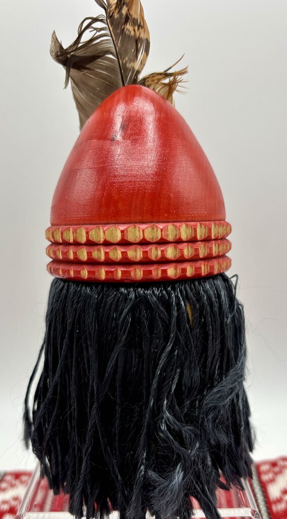 Wooden carved head of the medieval nobleman Vlad Dracula who ruled the Easter European province of Wallachia (now part of Romania). This ruler was in many was more fearsome than the fictional Dracula. The head comes with a hand loomed napkin. The carving is pre-owned but in very nice condition.