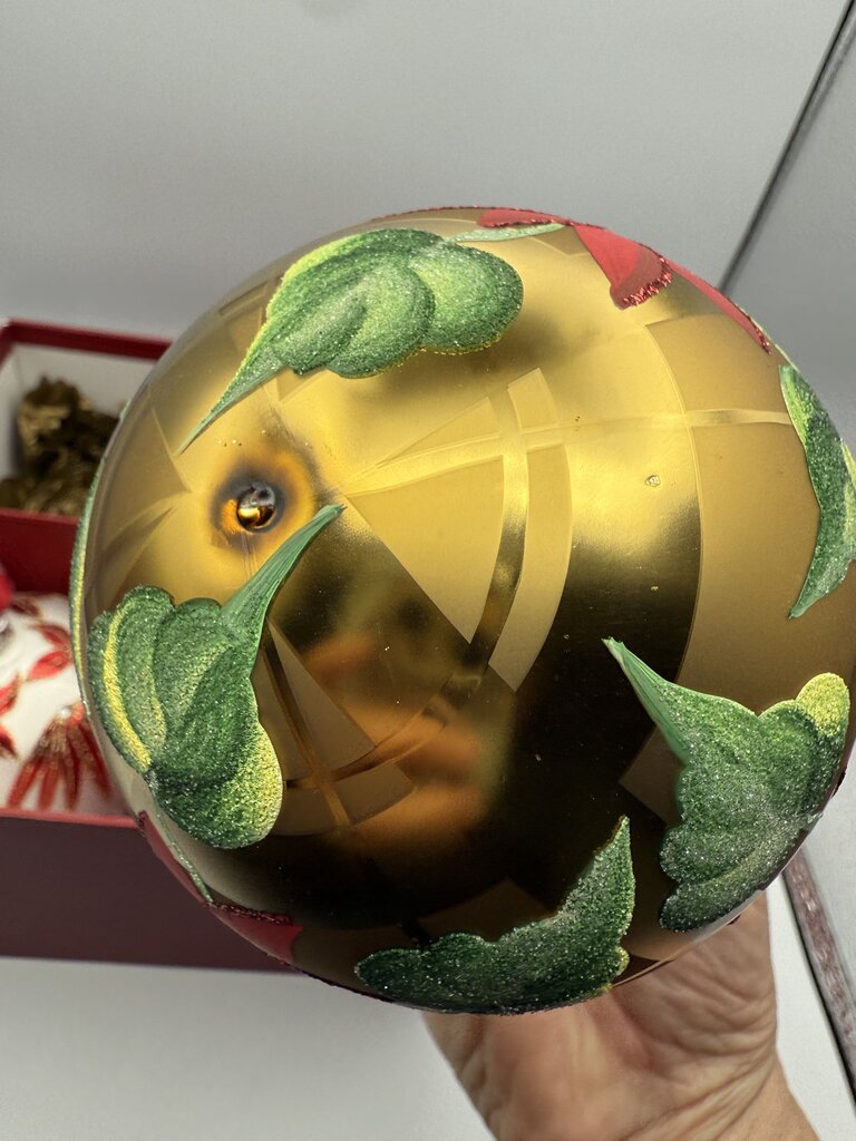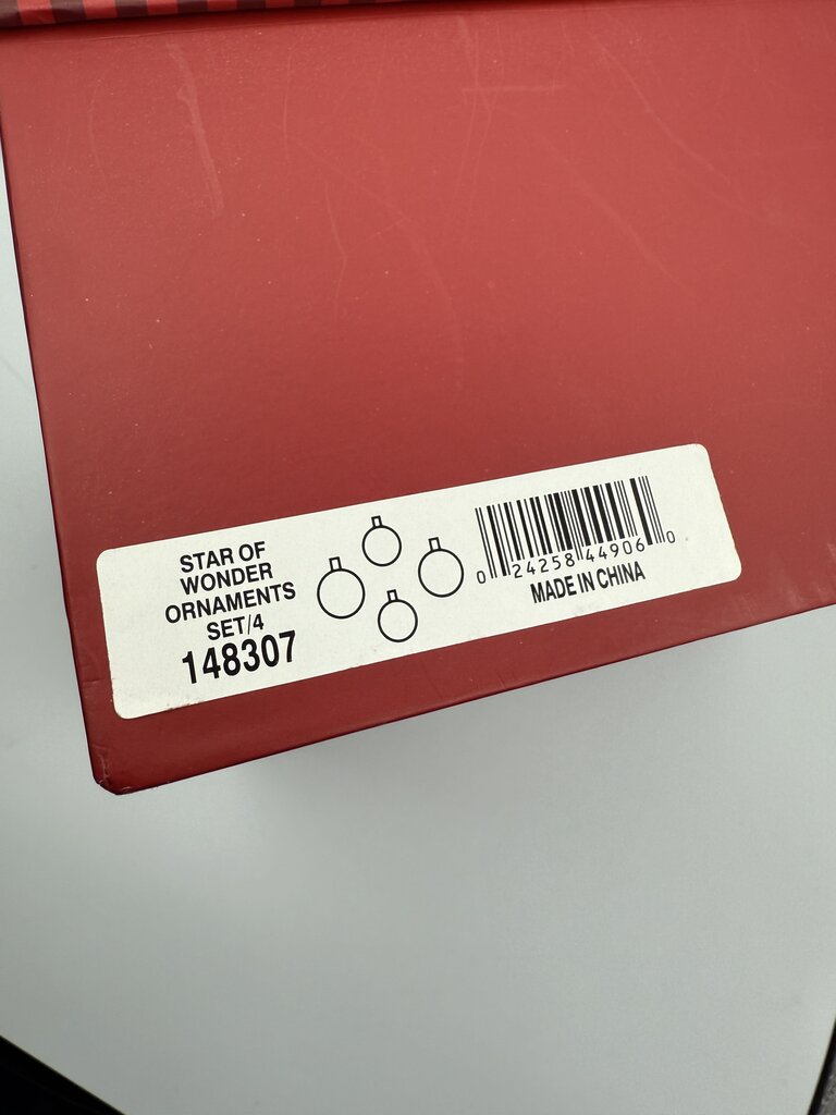 Waterford Holiday Heirlooms “Star Of Wonder” set of 3 ornaments in Red, Green and White. Ball glass ornaments measures 4” in diameter. Estate set, one additional ornament is added to this set from Lord & Taylor, a gold 4” ball glass ornament with painted pointsettia.