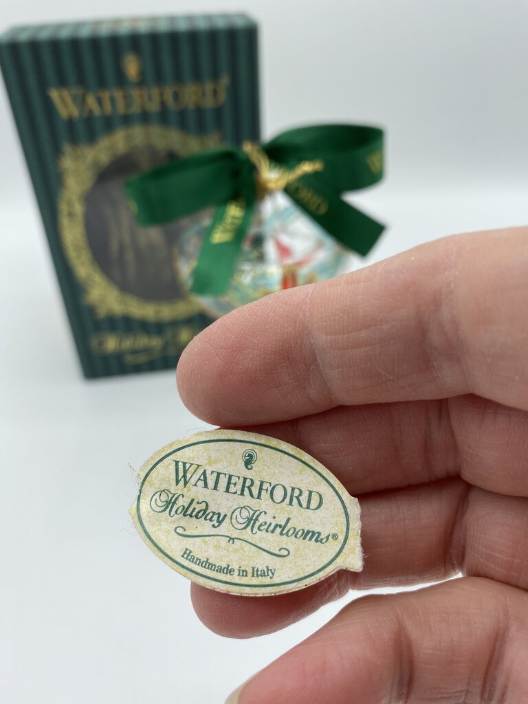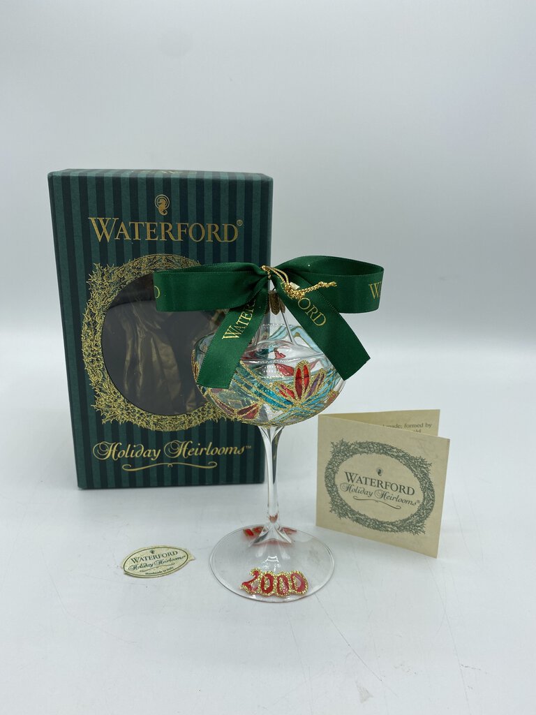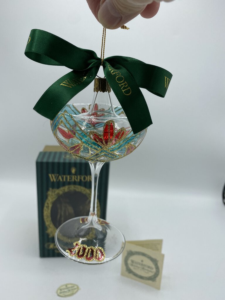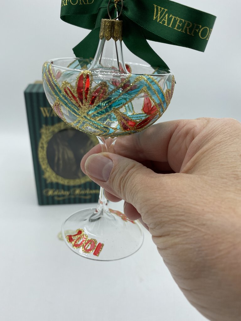 Collectable Waterford Ornament, like new condition with original box, tags and care instructions. Clear crystal champagne style glass painted with Red, Green and Gold accents. Classic! Ornament is approximately 4” tall.