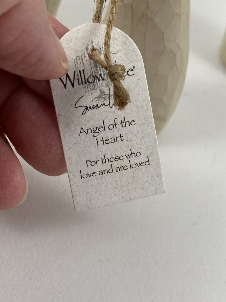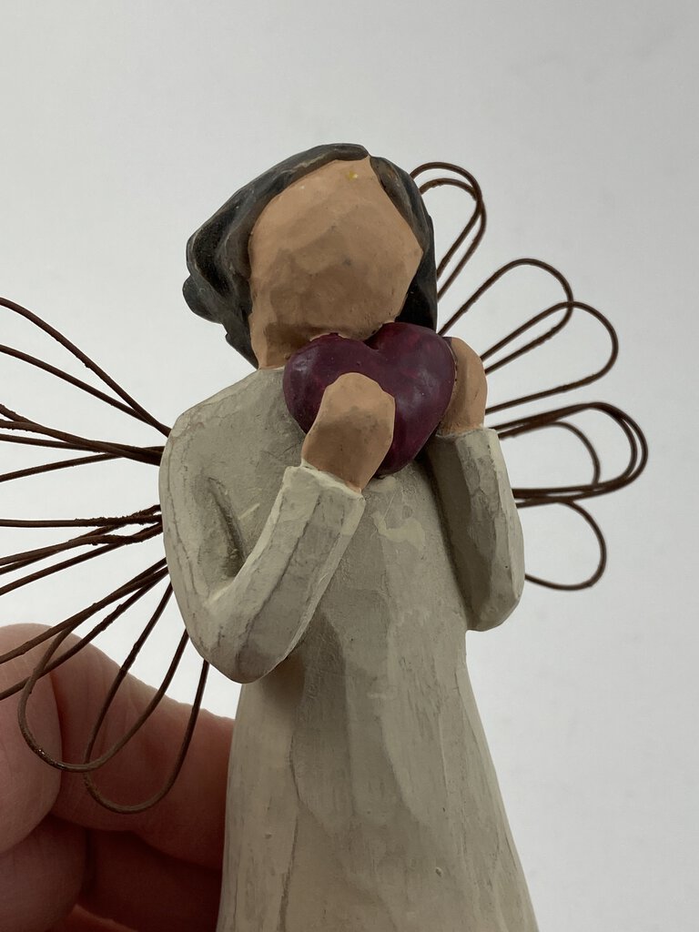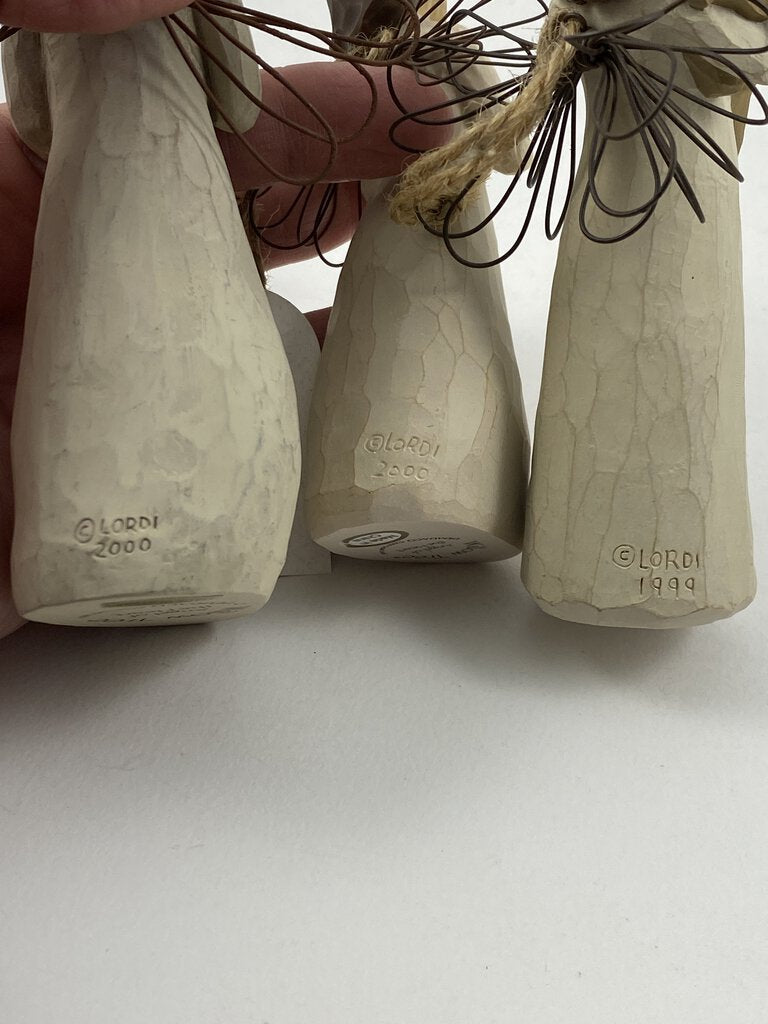 Adorable trio of Willow Tree angel figurines. This set includes the 5” tall “Angel of the Heart” hallmarked “Lordi 2000”. The 4.5” tall “Angel of the Heart” hallmarked “Lordi 2000” with it’s original tag attached. The final angle in the trio is the 4.5” tall “Angel of Friendship” hallmarked “Lordi 1999” with it’s original twine hanging string attached. This angel is holding her beloved dog. The heart angels are holding red hearts. No damage to any of the figurines. Great to display together or for gifting to your loved ones.
