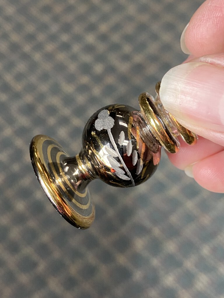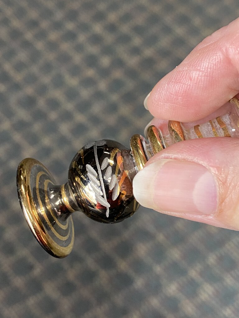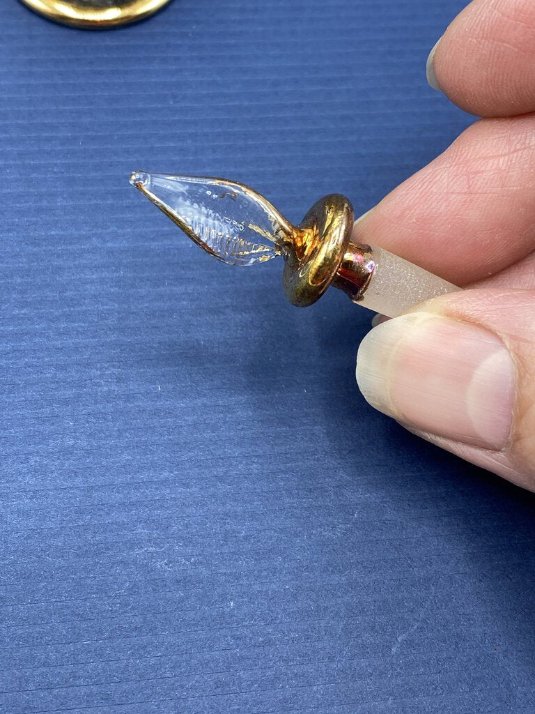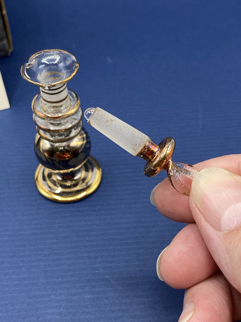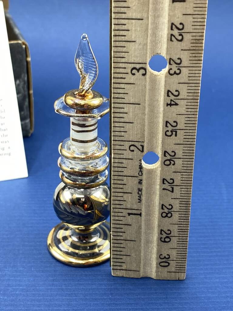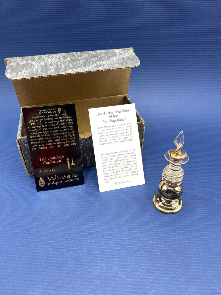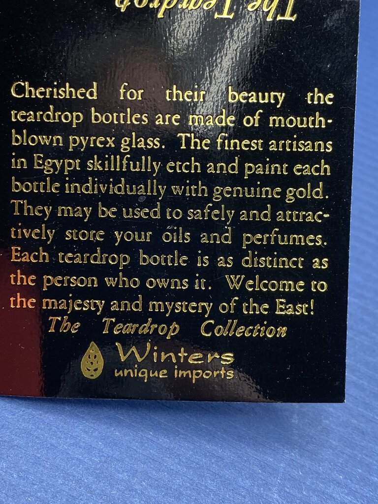 The Teardrop Collection presented by “Winters Unique Imports” 3” tall petite perfume bottle made of mouth blown Pyrex glass, etched and skillfully painted with gold trim. In original box with cards stating the history of the Teardrop Bottle. Great gift, no damage found in box or bottle.