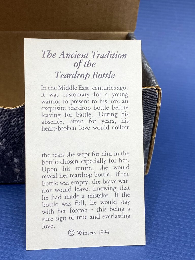The Ancient Tradition of the Teardrop Bottle ~ In the Middle East, centuries ago, it was customary for a young warrior to present to his love an exquisite teardrop bottle before leaving for battle. During his absence, often for years, his heart-broken love would collect the tears she wept for him in the bottle chosen especially for her. Upon his return, she would reveal her teardrop bottle. If the bottle was empty, the brave warrior would leave, knowing that he had made a mistake. If the bottle was full, he would stay with her forever- this being a sure sign of true everlasing love.