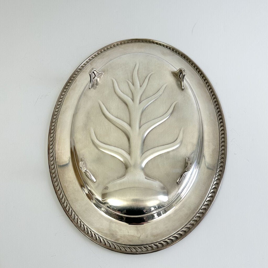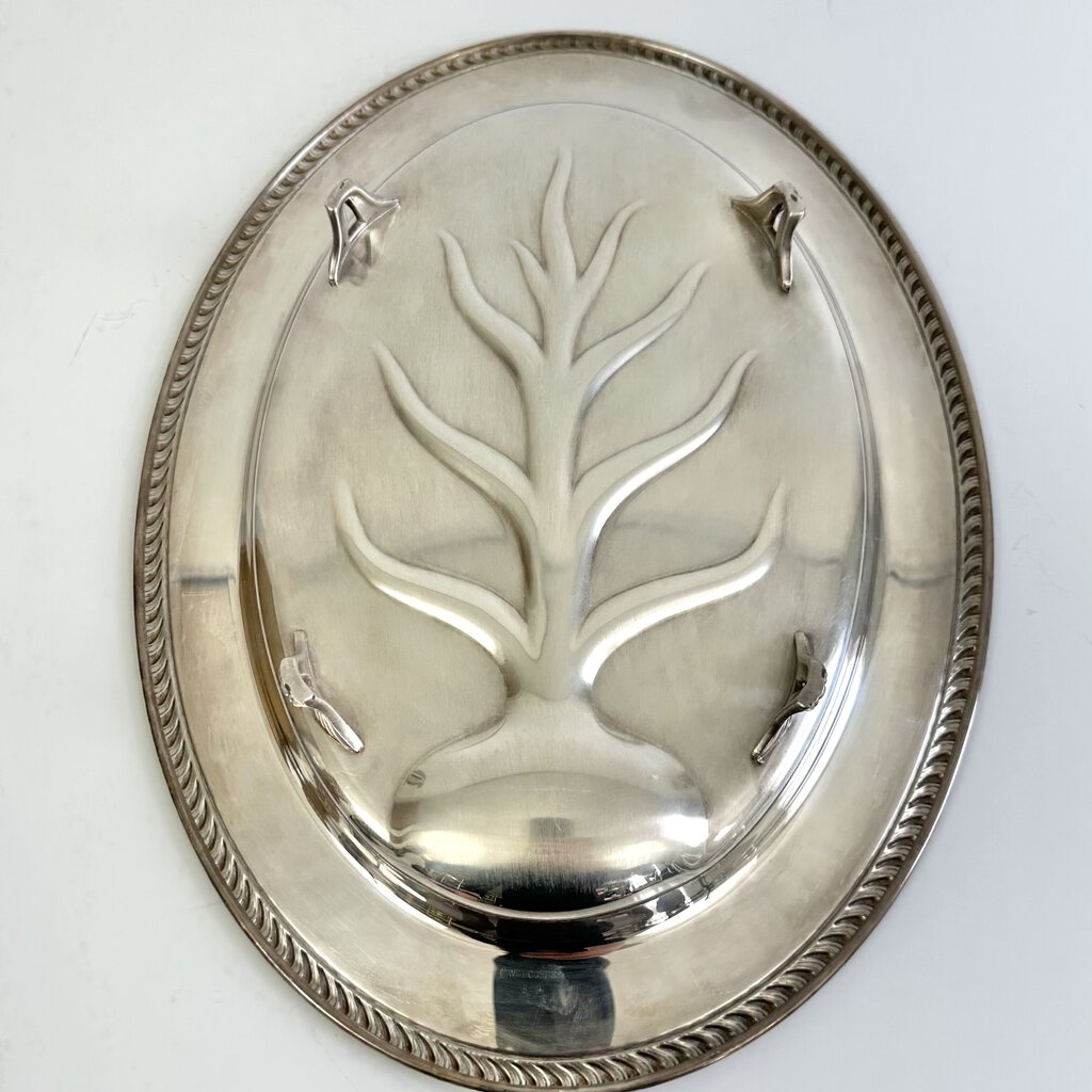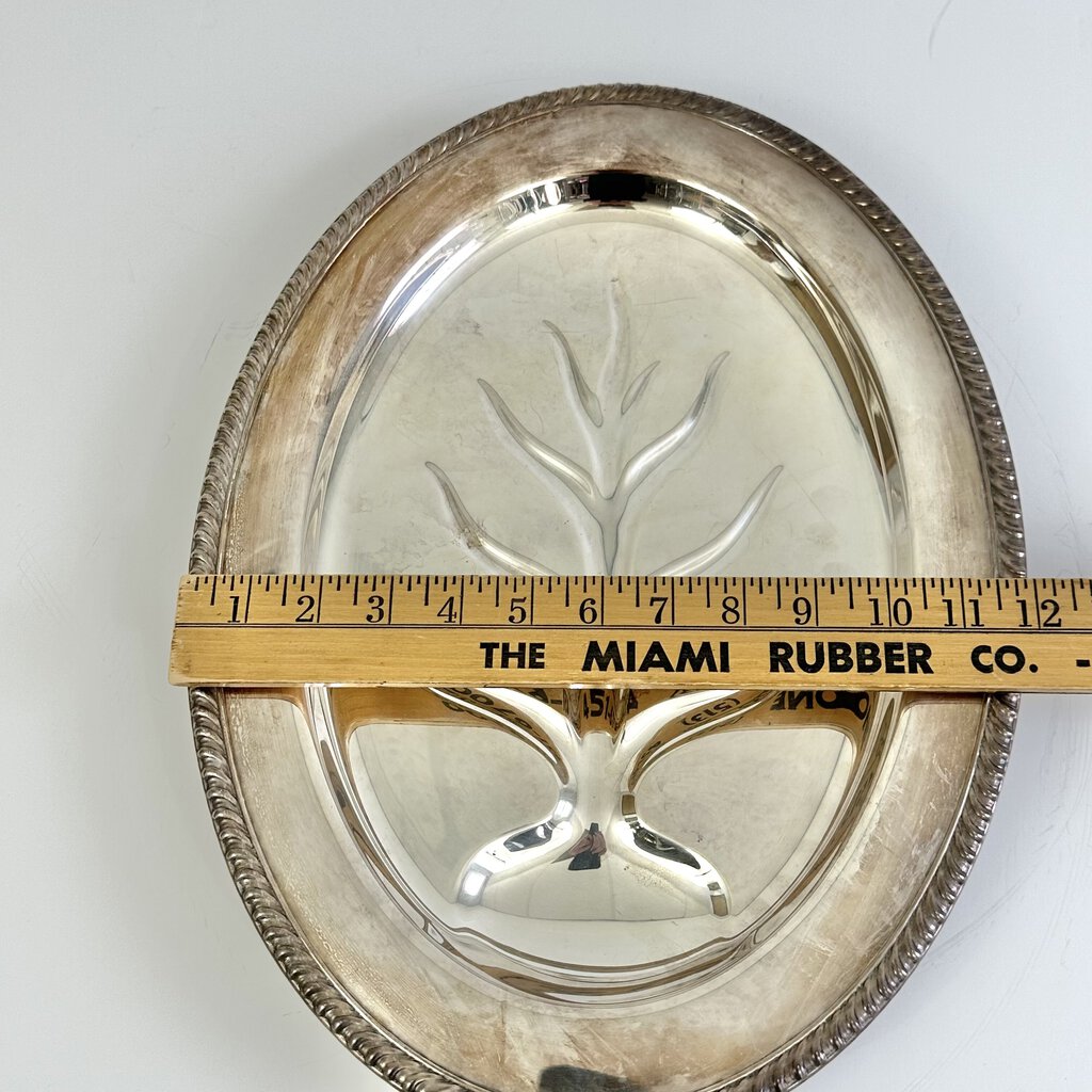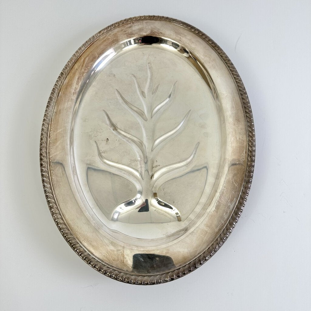 Vintage Wm. Rogers silver plated “Tree of Life” #810 footed Meat Serving Platter. 16 x 12 inches. The tree of life design collects the meat juices and prevents spilling. Also perfect for serving cupcakes, sandwiches etc. Would make a nice display piece too. In very good vintage condition, shows some scratches and is a little tarnished. Please see photos for details.