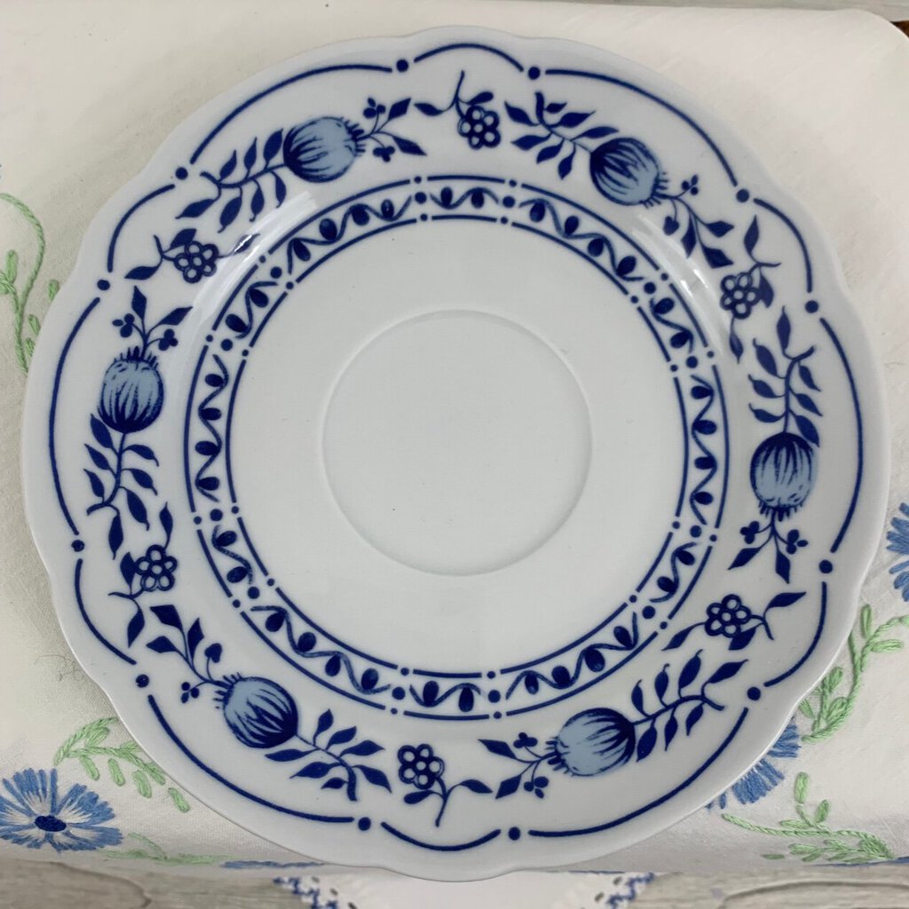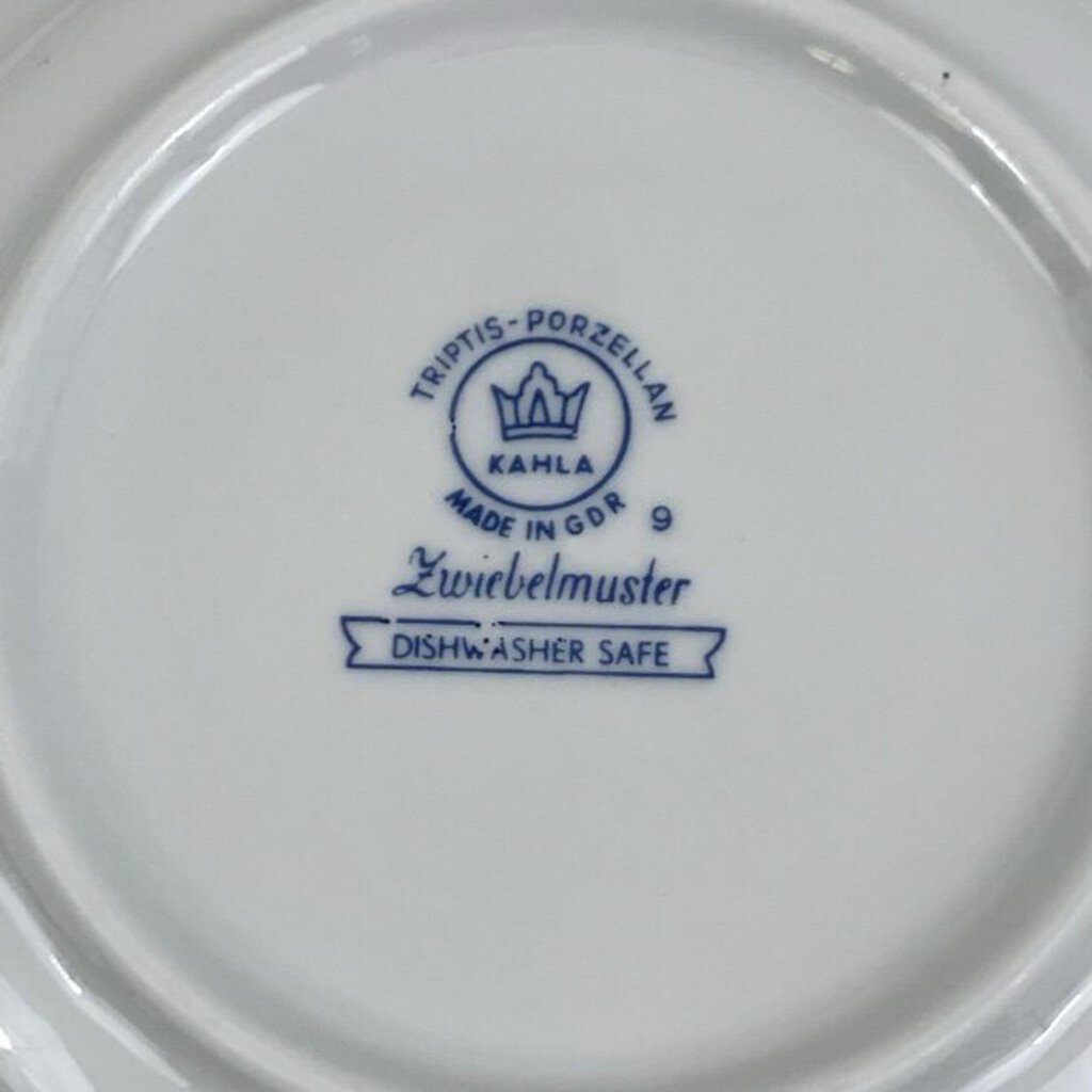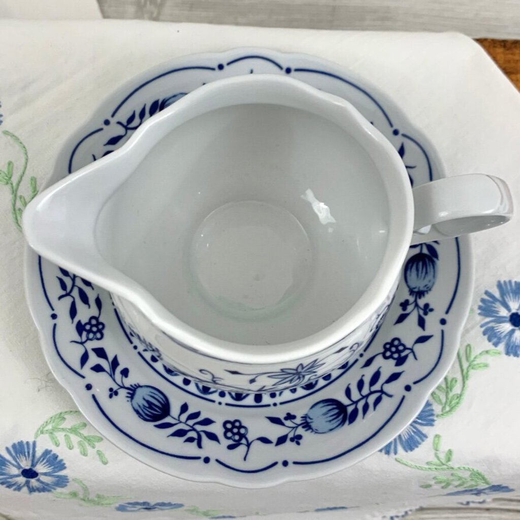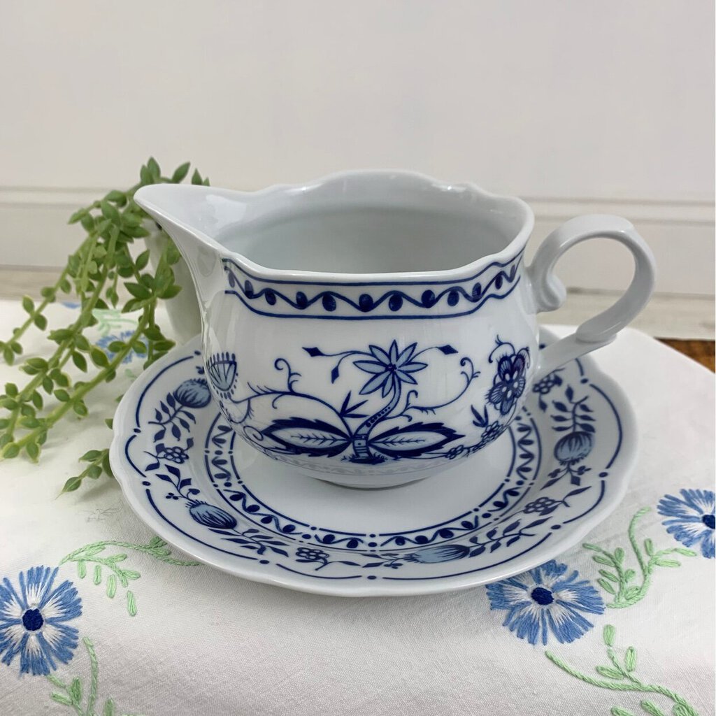 Zwiebelmuster/Blue Onion by Kahla Gravy Boat and Underplate Set. Blueware Gravy Boat and Underplate. Charming porcelain gravy boat and underplate set in the “Blue Onion” pattern by Kahla. Crafted in East Germany (GDR) between 1980-1995. The pattern is a whimsical depiction of onions, flowers and leaves in the classic blueware style. Blue Onion is a porcelain tableware pattern originally manufactured by Meissen Porcelain since the 18th century. In the 19th century, Kahla began producing the pattern, modeled after a pattern first produced by Chinese porcelain painters. This set was estate-owned and is in excellent condition, with no discernible cracks, chips, or crazing. Gravy Boat measures 3.5” in diameter and 3.25” in height. Underplate measures 6.75” in diameter. Please carefully review the photos for condition details.